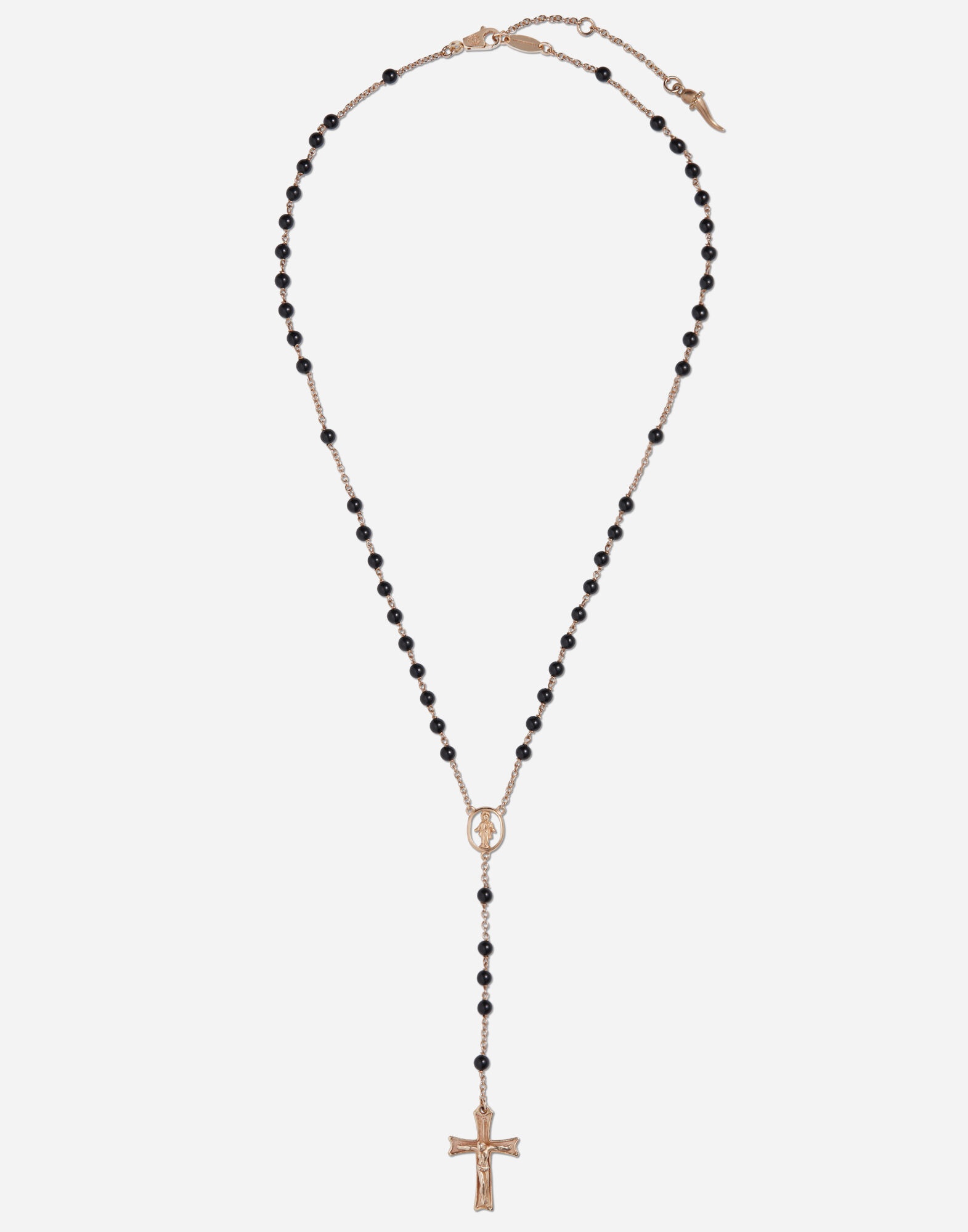 Rosary made up of forty-four black jade spheres with linked through weaving by hand. A red gold cross pendant with the "DOLCE&GABBANA" logo on the back is connected to the main wire by five black jade spheres and a medallion depicting the Madonna. A horn, symbol of superstition, has been added to the end of the adjustable chain. Technical specifications. • Gold 18 Kt • Length. 40 + 2,5 + 2,5 cm adjustable • Gemstones. 49 black jade spheres Red gold 18Kt