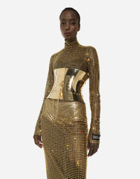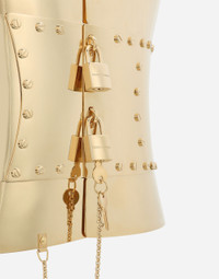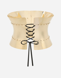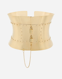 Rigid wide corset belt with padlocks: • Gold • Padlock fastening on the front • Leather ties on the back • Height: 22 cm • Nickel-free and hypoallergenic materials • Engraved logo • Made in Italy Care And Details External composition: 95% Brass 5% Cowhide