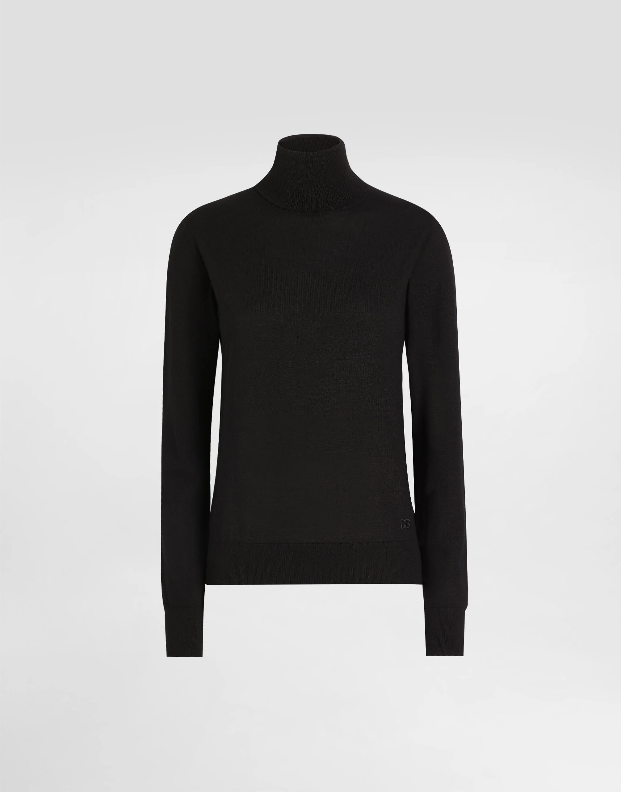 The Women's Black Sicily Collection reinforces Dolce&Gabbana's iconic fabrics and codes rooted in Italian heritage. Sensual silhouettes, highlighted by floral prints and refined corsetry, evoke an intriguing elegance, while the iconic black lace, satin, and velvet dominate the collection. Denim in various shades of blue introduces a contemporary twist, balancing the classic and modern. Embroidered crosses, medals, and jewelry add a sophisticated touch. Wool turtle-neck sweater with DG logo embroidery: • Black • 18-gauge knit • High neck • Long sleeves • French seam armholes • Dense hand • Ribbed neck and hem • Regular fit • The piece measures 61 cm from the shoulder seam on a size IT 40 • The model is 175 cm tall and wears a size IT 40 • Made in Italy External composition: 100% Virgin Wool