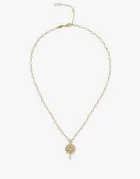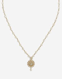 This necklace, composed of baroque pearls enmeshed by hand, features a refined rosette pendant formed by half pearls that define the circumference and a baroque pearl set into the centre. The gold frame with a volute pattern enhances the preciousness of the composition, alternating solids and voids to create an elegant play of light and shadow. The two terminals of the pendant and chain, both composed of a baroque pearl enmeshed by hand, accentuate the sophisticated style of the necklace. Technical specifications • Gold 18 Kt • Length. 45 + 2.5 + 2.5 adjustable. • Gems. 62 freshwater pearls, hemispherical and baroque. • Made in Italy Yellow 18 kt Gold
