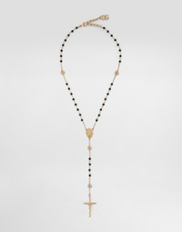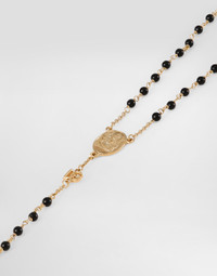 The Spring/Summer 2025 Women’s Collection is celebrating Italian beauty through bold and charismatic femininity. The 50s-inspired lingerie is the star, intermingling with fitted dresses, corsets and oversize trench coats. The iconic jackets have been updated with cropped cuts and modern inserts, while the floral prints add a romantic edge. The eveningwear shines with light fabrics and crystals, accompanied by look-defining accessories, from iconic bags to the cross earrings. Rosary-style necklace with decorative details and DG logo: • Gold • Black onyx beads • Length: 45 + 5 cm • Clasp fastening • Nickel-free and hypoallergenic materials • Engraved logo • Made in Italy External composition: 80% Brass 20% Natural Stone