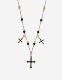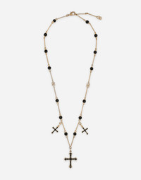 The Dolce&Gabbana Jewelry Collection is filled with unique pieces boasting great craftsmanship. Contemporary accessories with original and exclusive DG logo details, featuring different electroplated finishes, will be perfect for finishing off any look with great style. Semi-rigid necklace with rhinestone crystal crosses and spheres: • Gold • Snap-hook and chain fastening • Black acrylic glass spheres • Total measurement: 55 + 5 cm • Nickel-free and hypoallergenic materials • Engraved logo • Made in Italy Composition: 60% Brass 25% Acrylic glass 15% Glass