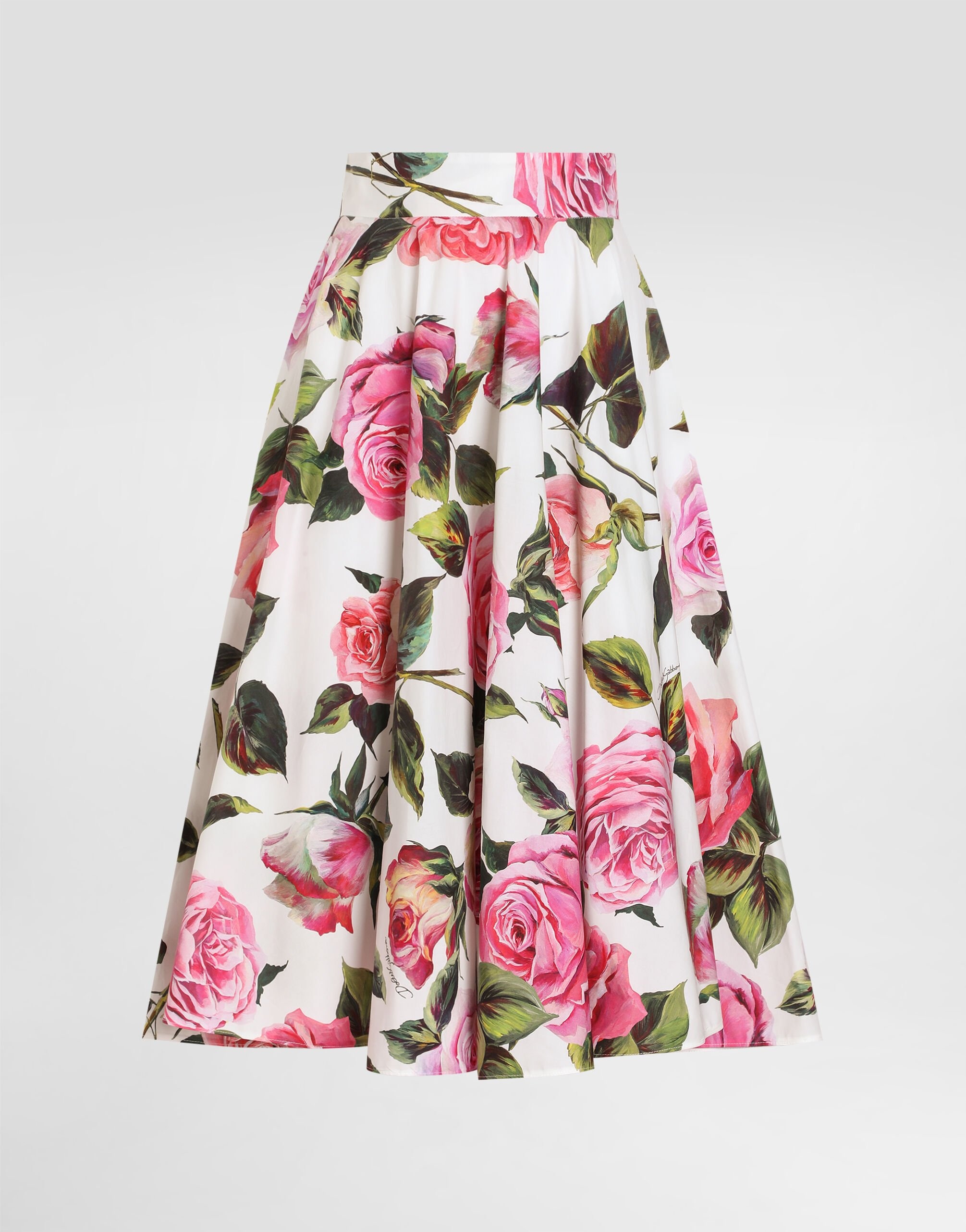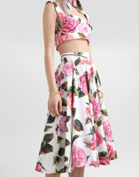The Spring/Summer 2025 Warm Weather Collection is a vibrant ode to the beauty of the floral world, celebrating the elegance and vitality that lie at the heart of the brand’s DNA. Delicate, colorful bouquets dance across light dresses, skirts, trousers, and beachwear, infusing each piece with a sense of romance and freshness. Coordinated accessories, from scarves to headbands, add charm. An explosion of color and blooms, this collection captures the brand’s unmistakable spirit. Cotton poplin calf-length circle skirt with rose print: • Multi-colored • High-waisted • Unlined • Rear zipper and hook-and-bar fastening • The piece measures 80 cm from the waist down on a size IT 40 • The model is 175 cm tall and wears a size IT 40 • Made in Italy The difference in the print placement that you may find on this product is a feature of Dolce&Gabbana’s “Handmade” pieces. A detail that makes every garment or accessory unique and exclusive. External composition: 100% Cotton