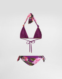 The Women’s DNA Collection is introducing a new side to femininity, which comes in shades of rose quartz, poised between sheerness and opacity, lightness and structure, formality and sensuality. Geometric Dolce Jackets, jacquard pajamas and floral brocade dresses intertwine with ultra-romantic designs. The DG print becomes an iconic statement, while Cordonetto lace and hints of Sicily Black embody the essence of a determined yet romantic femininity. Rose-print triangle bikini: • Multi-colored • Adjustable triangle bikini top • Bikini bottoms with adjustable ties • Branded DG logo in nickel-free metal • Matching PVC pouch • Made in Italy The difference in the print placement that you may find on this product is a feature of Dolce&Gabbana’s “Handmade” pieces. A detail that makes every garment or accessory unique and exclusive. External composition: 72% Polyamide 28% Spandex Internal composition: 88% Polyamide 12% Spandex