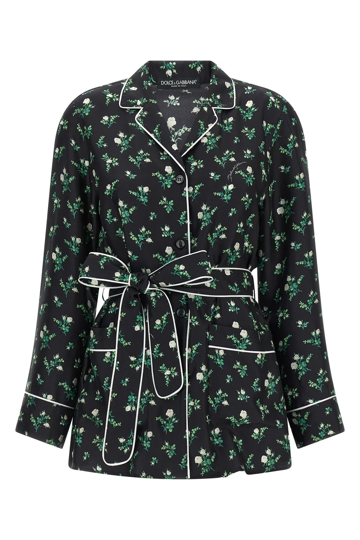 cod. F5I89TIS13GHX6CB Roselline and Mughetti print silk twill shirt, pajama model with lapel neckline, front button closure, belt loops at the waist, front pockets, side slits, contrast piping detail on the edges. The differences in print placement you might find on this product is a characteristic of Dolce&Gabbana's Handmade products. Color: Black Size & Fit: True to size fit Composition: 100% silk Made in: Italy