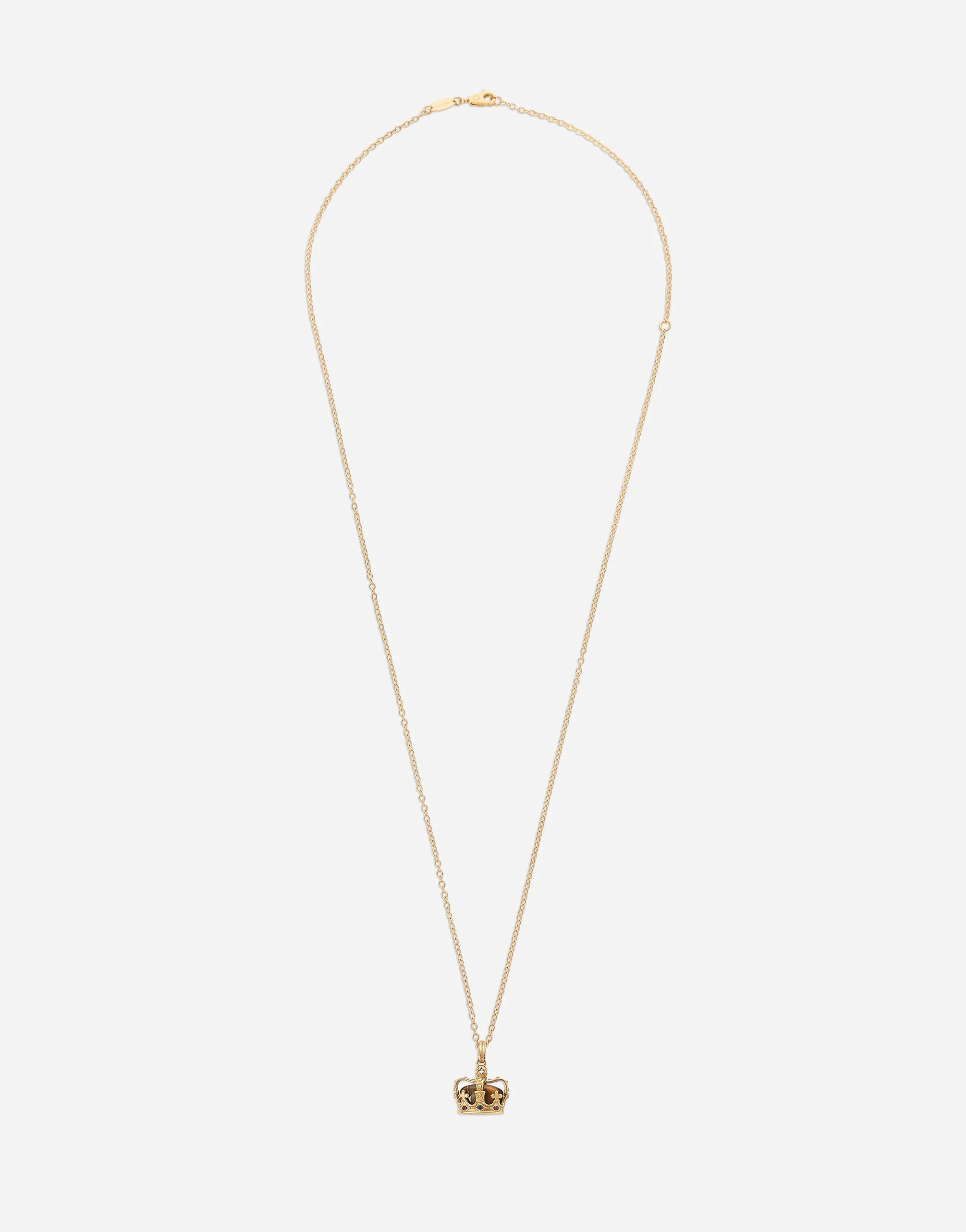 The necklace is distinguished by the pendant made up of a crown-shaped element with an iron eye cushion that features two rubies and a sapphire set at the base. An oval tag bearing the DOLCE&GABBANA logo is placed before the closure. Technical features: Gold 750/000 Length: 55+10 cm adjustable Gems: 1 iron eye cabochon quartz; 1 round blue sapphire; 2 round rubies. Made in Italy Yellow 18 kt gold