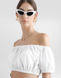The Spring/Summer 2025 Warm Weather Collection is a vibrant ode to the beauty of the floral world, celebrating the elegance and vitality that lie at the heart of the brand’s DNA. Delicate, colorful bouquets dance across light dresses, skirts, trousers, and beachwear, infusing each piece with a sense of romance and freshness. Coordinated accessories, from scarves to headbands, add charm. An explosion of color and blooms, this collection captures the brand’s unmistakable spirit. Cotton poplin Bardot-neck crop top: • White • Bardot neckline • Short sleeves • Stretch trims • Unlined • The piece measures 20.7 cm from the center back on a size IT 40 • The model is 175 cm tall and wears a size IT 40 • Made in Italy External composition: 100% Cotton