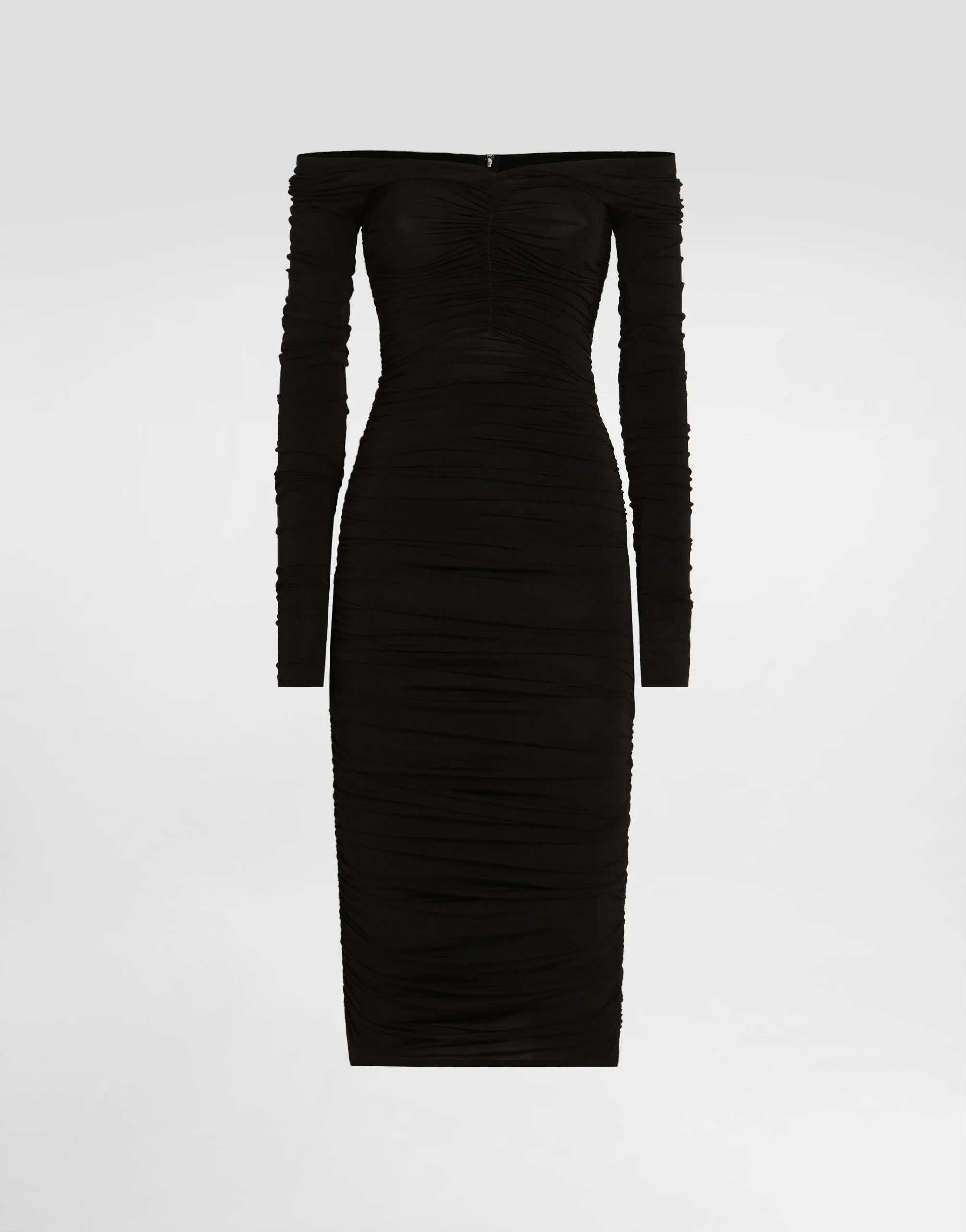The Women's Black Sicily Collection reinforces Dolce&Gabbana's iconic fabrics and codes rooted in Italian heritage. Sensual silhouettes, highlighted by floral prints and refined corsetry, evoke an intriguing elegance, while the iconic black lace, satin, and velvet dominate the collection. Denim in various shades of blue introduces a contemporary twist, balancing the classic and modern. Embroidered crosses, medals, and jewelry add a sophisticated touch. Viscose organzine draped calf-length dress with draping: • Black • V-neck on the front and back • Long sleeves • Unlined • Zipper fastening at the back • The piece measures 70 cm from the waist down on a size IT 40 • The model is 175 cm tall and wears a size IT 40 • Made in Italy External composition: 94% Viscose 06% Spandex