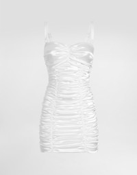 The Spring/Summer 2025 Women’s Collection is celebrating Italian beauty through bold and charismatic femininity. The 50s-inspired lingerie is the star, intermingling with fitted dresses, corsets and oversize trench coats. The iconic jackets have been updated with cropped cuts and modern inserts, while the floral prints add a romantic edge. The eveningwear shines with light fabrics and crystals, accompanied by look-defining accessories, from iconic bags to the cross earrings. Stretch satin draped mini dress: • White • Sweetheart neckline • Padded underwired cups • Sleeveless with adjustable stretch straps • Boned bodice • Stretch silk satin lining • Rear zipper and hook-and-bar fastening • The piece measures 40 cm from the waist down on a size IT 40 • The model is 175 cm tall and wears a size IT 40 • Made in Italy External composition: 63% Acetate 28% Polyamide 05% Silk 04% Spandex Internal composition: 92% Silk 08% Spandex