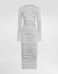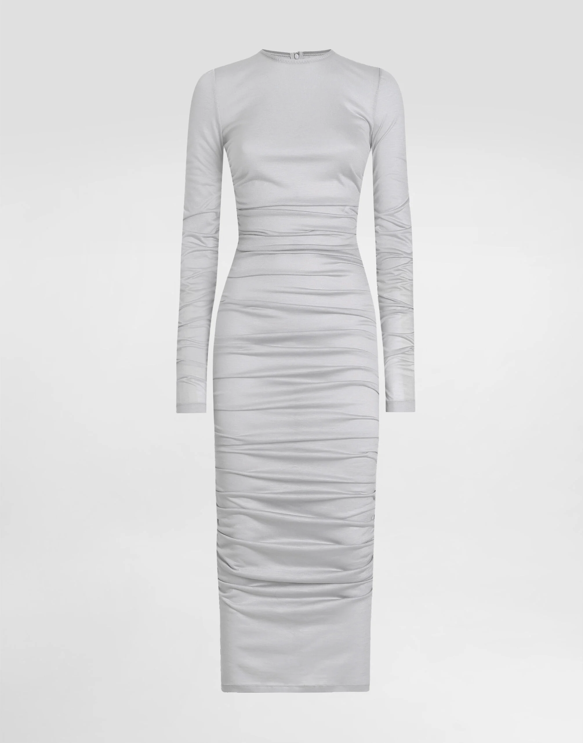 The Everyday Women's Collection reimagines contemporary daily wear with Dolce&Gabbana's signature style codes. Iconic fabrics mix with standout details like embroidered flowers, crystals, and jewel buttons, infusing elegance into every look. Gray animal print accented with green and purple, hyper-geometric jewelry, voluminous shapes and transparencies add unique touches. Men's tweed is reinvented with graphic twists, creating distinctive pieces that reflect refined sensuality. Draped wool jersey calf-length dress: • Gray • Round neck • Long sleeves • Unlined • Rear zipper and hook-and-bar fastening • The piece measures 90 cm from the waist down on a size IT 40 • The model is 175 cm tall and wears a size IT 40 • Made in Italy External composition: 100% Virgin Wool