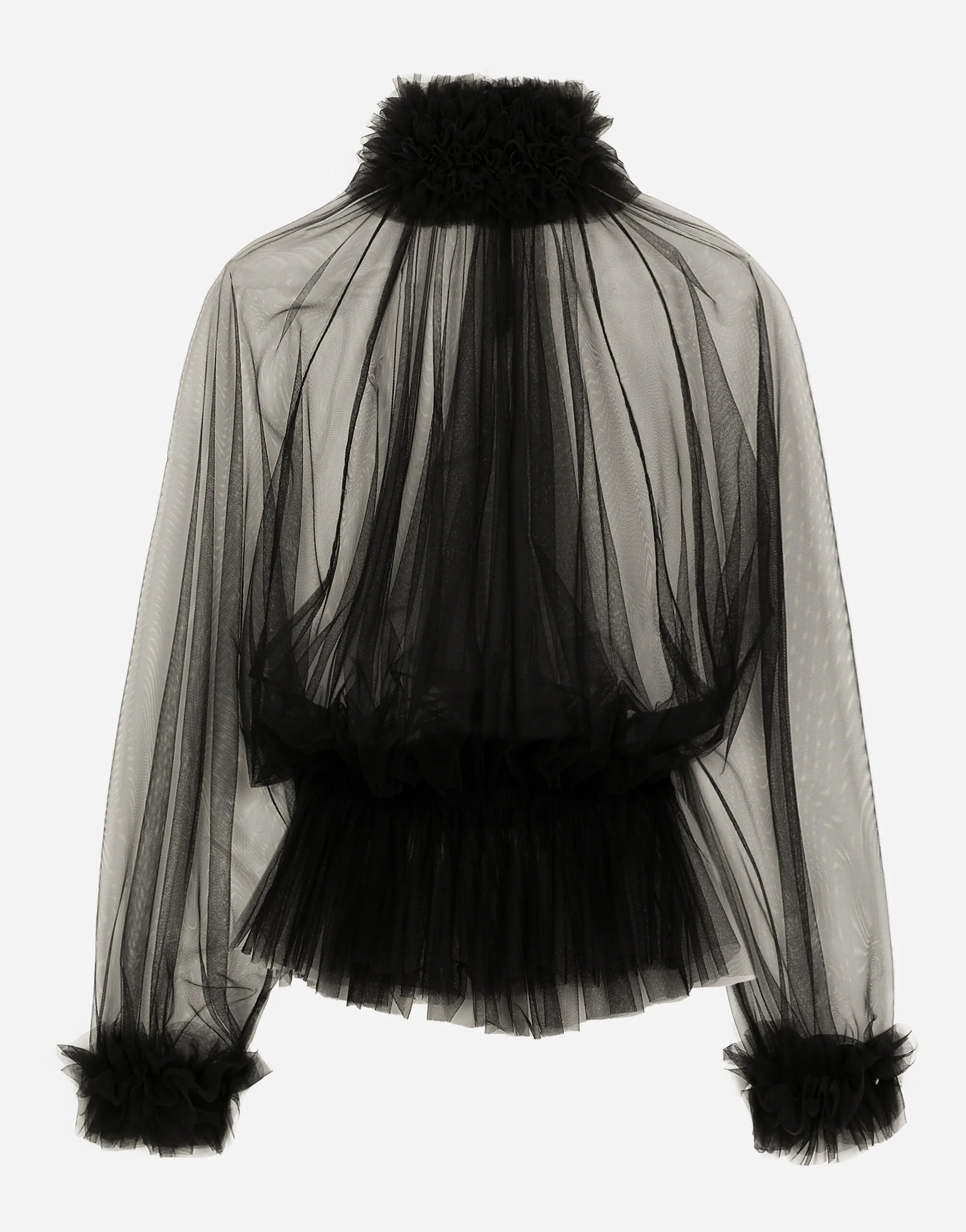 In the “WOMAN SS 24” Collection, the imagery of old Sicily interacts with the masculine, with sensual shapes, lace, nude tones and delicate overlays, to create pieces that move amid clean silhouettes, the elegance of the 1960s, the contrasts of black and white and luxurious textures. The designers are reworking their signature style and their iconic Sicilia black color to convey an aware, seductive and confident Sicilian WOMAN who is imbued with sensuality. Stretch tulle blouse with ruffles on the neck and cuffs: • Black • High neck • Long sleeves • Loose fit • Unlined • Stretch cuffs and hem • The piece measures 79 cm from the center back on a size IT 40 • The model is 175 cm tall and wears a size IT 40 • Made in Italy External composition: 100% Polyamide