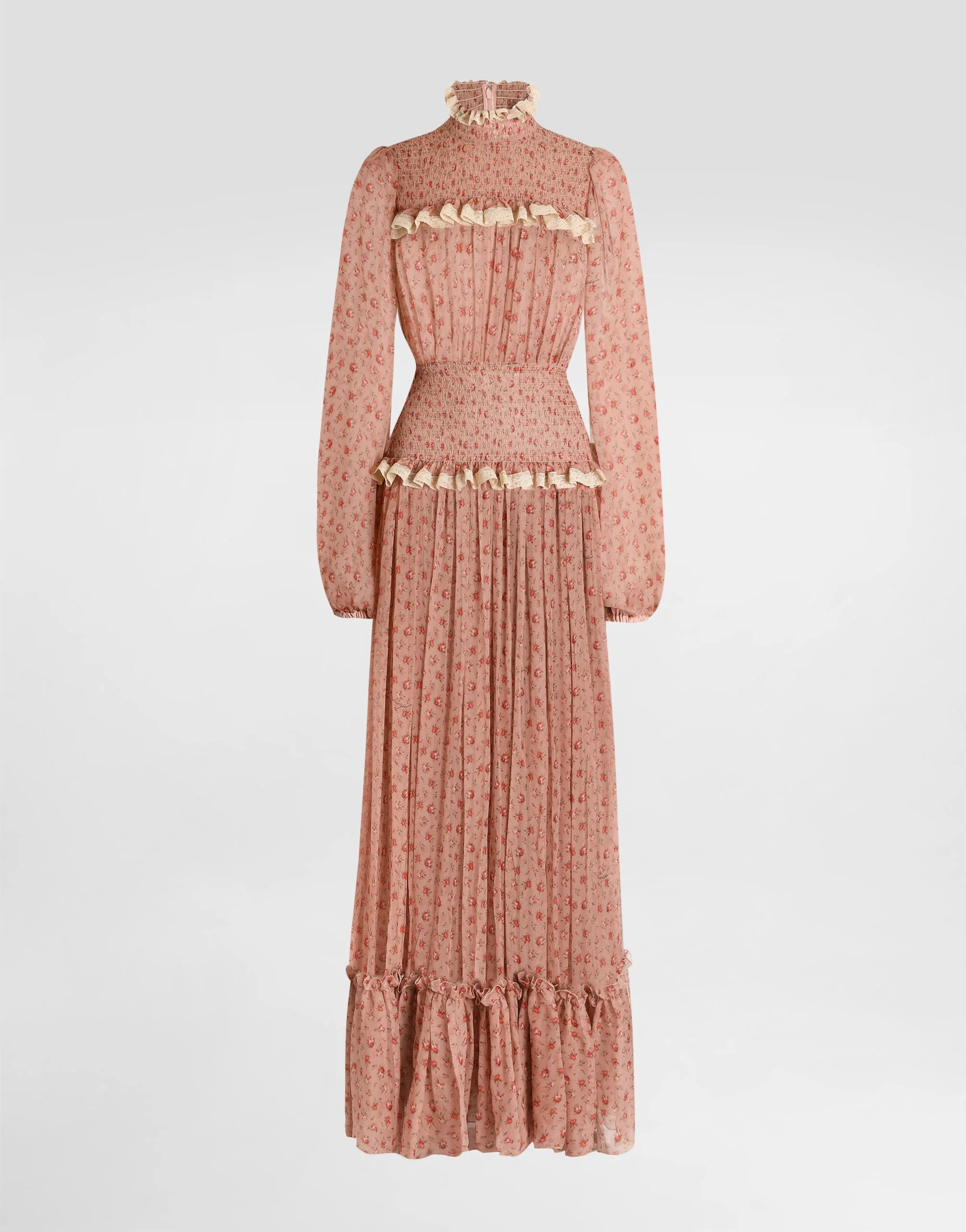 This long dress in printed chiffon is a perfect example of timeless elegance. The careful workmanship and refined details make it ideal for any special occasion, enhancing femininity with a touch of delicacy and sophisticated style. Small rose-print long chiffon dress: • Multi-colored • High neck • Smocked peplum and neck • Lace trim on collar and yoke • Long wide and gathered skirt • Wide and long sleeves with elastic at the bottom • Invisible zip on the back • Matching slip length 110 cm on size 40 IT • Skirt length from real waist 115 cm on size 40 IT • Center back length 128 cm on size 40 IT • The model is 175 cm tall and wears size 40 IT • Made in Italy The difference in the print placement that you may find on this product is a feature of Dolce&Gabbana’s “Handmade” pieces. A detail that makes every garment or accessory unique and exclusive. External Composition: 90% Silk, 9% Cotton, 1% Polyamide