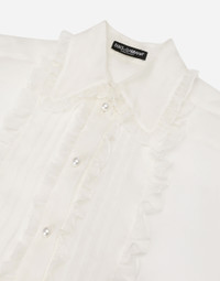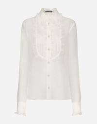 In the “WOMAN SS 24” Collection, the imagery of old Sicily interacts with the masculine, with sensual shapes, lace, nude tones and delicate overlays, to create pieces that move amid clean silhouettes, the elegance of the 1960s, the contrasts of black and white and luxurious textures. The designers are reworking their signature style and their iconic Sicilia black color to convey an aware, seductive and confident Sicilian WOMAN who is imbued with sensuality. Silk organza shirt with shirt front and ruffles: • White • Long sleeves • Regular fit • Unlined • Button fastenings • The piece measures 65 cm from the center back on a size IT 40 • The model is 175 cm tall and wears a size IT 40 • Made in Italy External composition: 100% Silk