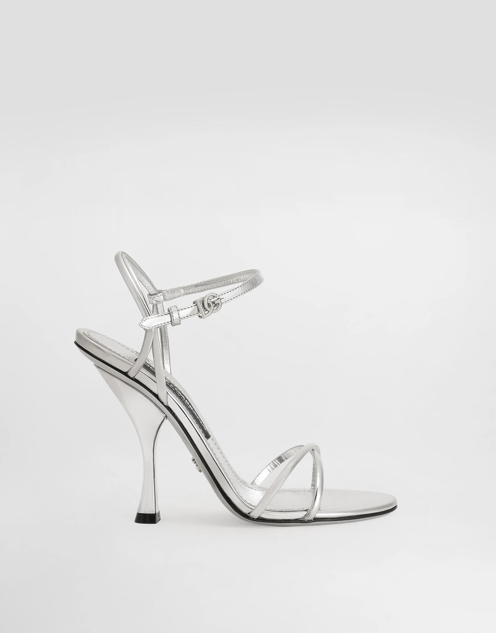 Elegance, tailored lines and sparkling details define the Dolce&Gabbana Holiday collection. Sixties inspirations blend with a contemporary aesthetic. For him, structured jackets and cuts that enhance the silhouette for her, silver brocade and crystals illuminate festive looks. Each piece stands out for its fine materials, attention to detail and distinctive style. This mirrored sandals reflects timeless elegance and essential sophistication, perfect for adding a touch of glamour to any formal outfit. Mirror calfskin sandals: • Silver • Keira 2.0 shape • Leather outsole with DG logo metal detail • Open toe leather insole customized with label • Customization with buckle • Palladium plate • Item equipped with black cotton bag and black embossed box • Heel height 105 mm • Made in Italy External composition: 100% Calfskin Internal composition: 69% Goatskin, 31% Calfskin