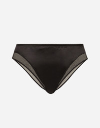 In the “WOMAN SS 24” Collection, the imagery of old Sicily interacts with the masculine, with sensual shapes, lace, nude tones and delicate overlays, to create pieces that move amid clean silhouettes, the elegance of the 1960s, the contrasts of black and white and luxurious textures. The designers are reworking their signature style and their iconic Sicilia black color to convey an aware, seductive and confident Sicilian WOMAN who is imbued with sensuality. Satin and tulle panties: • Black • Regular rise • Form fitting • Made in Italy Given the product characteristics, unfortunately some items in the underwear category cannot be returned. For more information, please consult the Returns and Refunds section. External composition: 85% Silk 10% Polyamide 5% Spandex