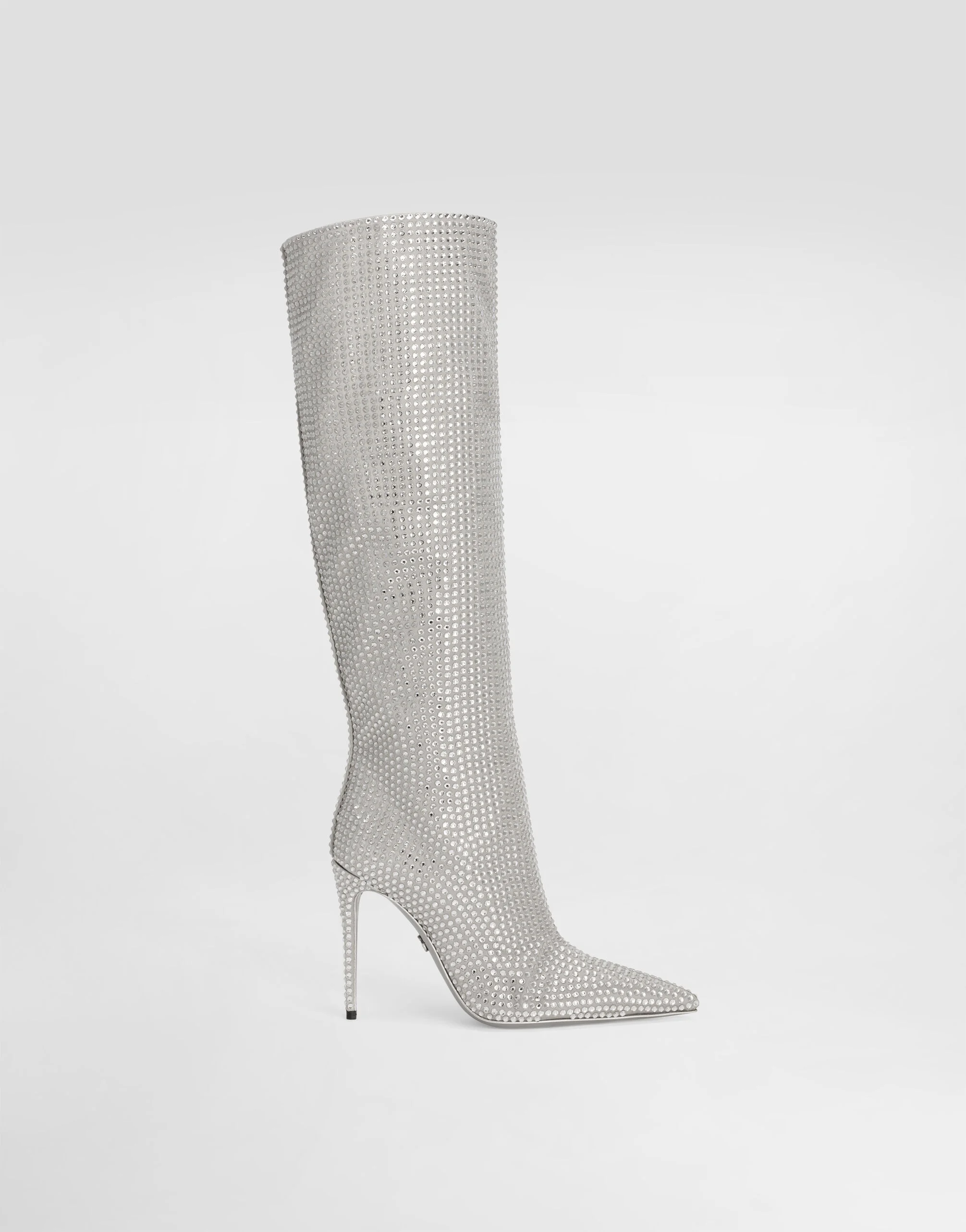 Satin Lollo boots with all-over rhinestone embellishment: • Fusible rhinestones on the satin upper • 105-mm heel • Kidskin insole with branded label • Foiled leather sole with logo • Made in Italy Care And Details External composition: 68% Viscose 32% Silk Internal composition: 61% Lambskin 39% Goatskin