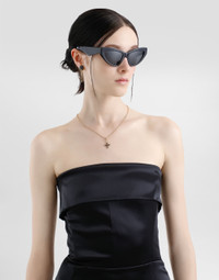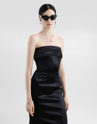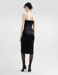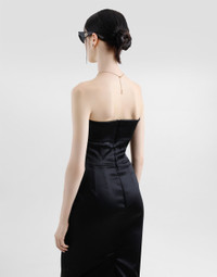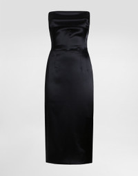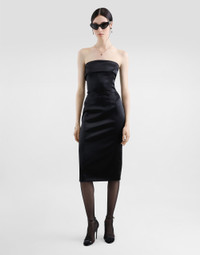 The Women's Black Sicily Collection reinforces Dolce&Gabbana's iconic fabrics and codes rooted in Italian heritage. Sensual silhouettes, highlighted by floral prints and refined corsetry, evoke an intriguing elegance, while the iconic black lace, satin, and velvet dominate the collection. Denim in various shades of blue introduces a contemporary twist, balancing the classic and modern. Embroidered crosses, medals, and jewelry add a sophisticated touch. Stretch satin calf-length corset sheath dress: • Black • Strapless with folded trim on neckline • Vertical boned bodice • Sleeveless • Stretch silk satin lining • Rear zipper and hook-and-bar fastening • The piece measures 70 cm from the waist down on a size IT 40 • The model is 175 cm tall and wears a size IT 40 • Made in Italy External composition: 65% Acetate 29% Polyamide 06% Spandex Internal composition: 92% Silk 08% Spandex