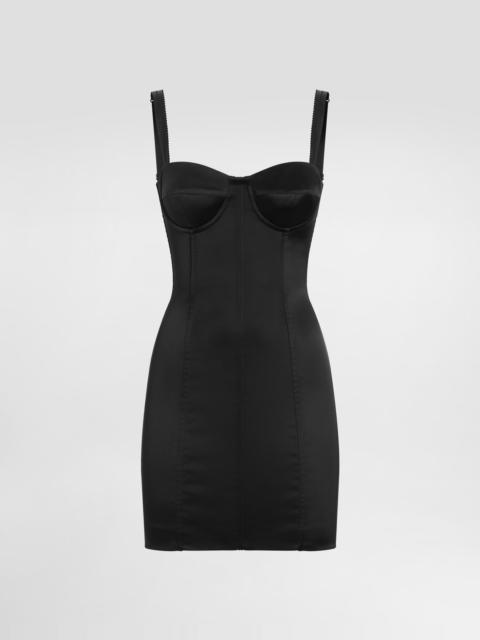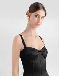 The DNA collection is distinguished by timeless shapes, bringing together three concepts: Sicilian flair, tailoring and sensuality. Nero Sicilia black and optical white predominate and pair with colors that catapult us onto the island of Sicily and make us dream. The designers channel the timeless wardrobe made up of creations that are instantly unmistakable in their simplicity, presenting us with sophisticated beauty loaded with meaning and symbolism that transcends fashion. Stretch satin corset minidress: • Black • Sweetheart neckline • Adjustable stretch straps • Molded cups with underwiring • Stretch satin lining • Rear zipper and hook-and-eye fastening • The piece measures 40 cm from the waist down on a size IT 40 • The model is 175 cm tall and wears a size IT 40 • Made in Italy External composition: 90% Cotton 10% Viscose Internal composition: 100% Silk