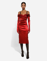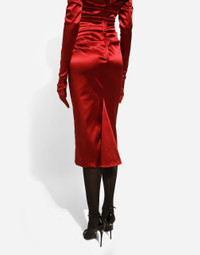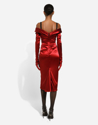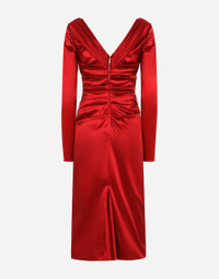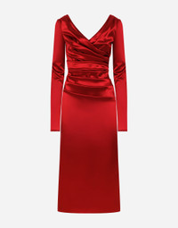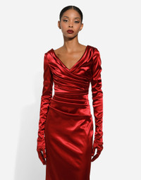The FW23-24 Collection is sensual, conveying a side of femininity that has nothing to do with being sexy. Sensuality is intrinsically connected to an inner experience that makes women spontaneous and natural, yet charisma is essential. Lace, tulle and chiffon caress the body and redesign shape. Gold and silver create an aura that amplifies sensuality, while white and red celebrate the real meaning of sensuality, representing instinctive passion and deep love. Stretch satin draped calf-length dress: • Red • V-neck with draped crossover detailing • Long sleeves • Stretch silk satin lining • Rear zipper and hook-and-eye fastening • The piece measures 85 cm from the waist down on a size IT 40 • The model is 175 cm tall and wears a size IT 40 • Made in Italy External composition: 65% Acetate 29% Polyamide 6% Spandex Internal composition: 92% Silk 8% Spandex