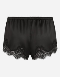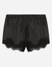 Diese edlen Dessous-Shorts aus elastischem Seidensatin mit Spitzenbordüre aus Baumwolle bestechen durch ihren sinnlichen; edlen Look. • Covered elastic on the waist • Loose fit • Made in Italy External composition: 80% Silk 12% Cotton 5% Spandex 3% Polyamide