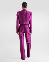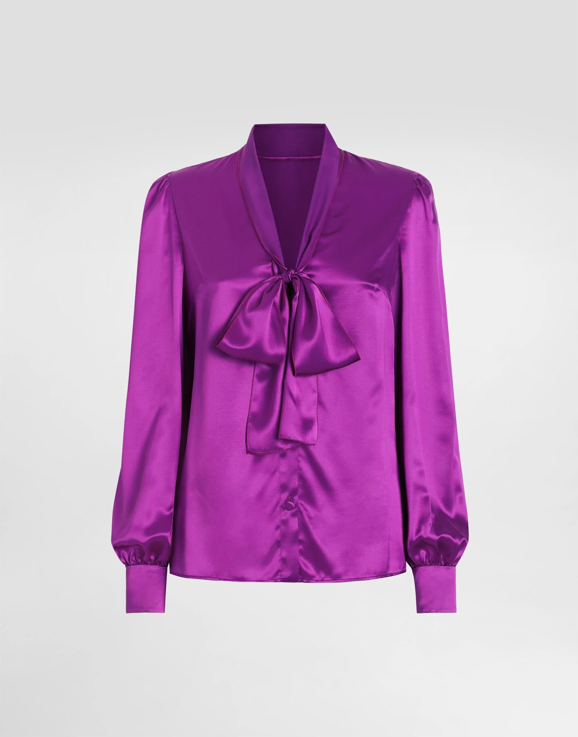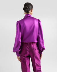 The Everyday Women's Collection reimagines contemporary daily wear with Dolce&Gabbana's signature style codes. Iconic fabrics mix with standout details like embroidered flowers, crystals, and jewel buttons, infusing elegance into every look. Gray animal print accented with green and purple, hyper-geometric jewelry, voluminous shapes and transparencies add unique touches. Men's tweed is reinvented with graphic twists, creating distinctive pieces that reflect refined sensuality. Silk satin shirt with pussy-bow: • Purple • V-neck with pussy-bow • Long sleeves with gathered cuffs • Regular fit • Front box pleat and button fastenings with branded bottom edge • The piece measures 65 cm from the rear collar seam on a size IT 40 • The model is 175 cm tall and wears a size IT 40 • Made in Italy External composition: 100% Silk
