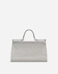 Sicily bag in satin with all-over rhinestones and the palladium-plated metal logo tag: • Front flap with hidden double magnetic fastening • Branded tag • Top handle and adjustable, detachable strap in foiled iguana-print calfskin • Satin lining • Inner pocket with branded zipper , card compartment and a cell phone holder • Item comes with a branded dust bag • Measurements: 18 x 29 x 2.5 cm • Made in Italy Care And Details External composition: 55% Viscose 25% Silk 20% Calfskin Internal composition: 50% Viscose 25% Silk 10% Calfskin 10% Polyamide 5% Polyurethane