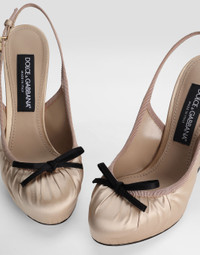 Beauty, sensuality and allure have inspired the Sfilata collection. These new Vally slingbacks come in hand-gathered satin with gros-grain piping and bow applique on the upper. Satin platform slingbacks with bow detail: • Cream • 105-mm platform • Adjustable gros-grain strap with DG logo • Kidskin insole with branded label • Branded leather sole • Item comes with a branded dust bag • Made in Italy External composition: 53% Viscose 41% Cotton 6% Silk Internal composition: 76% Goatskin 16% Viscose 8% Silk