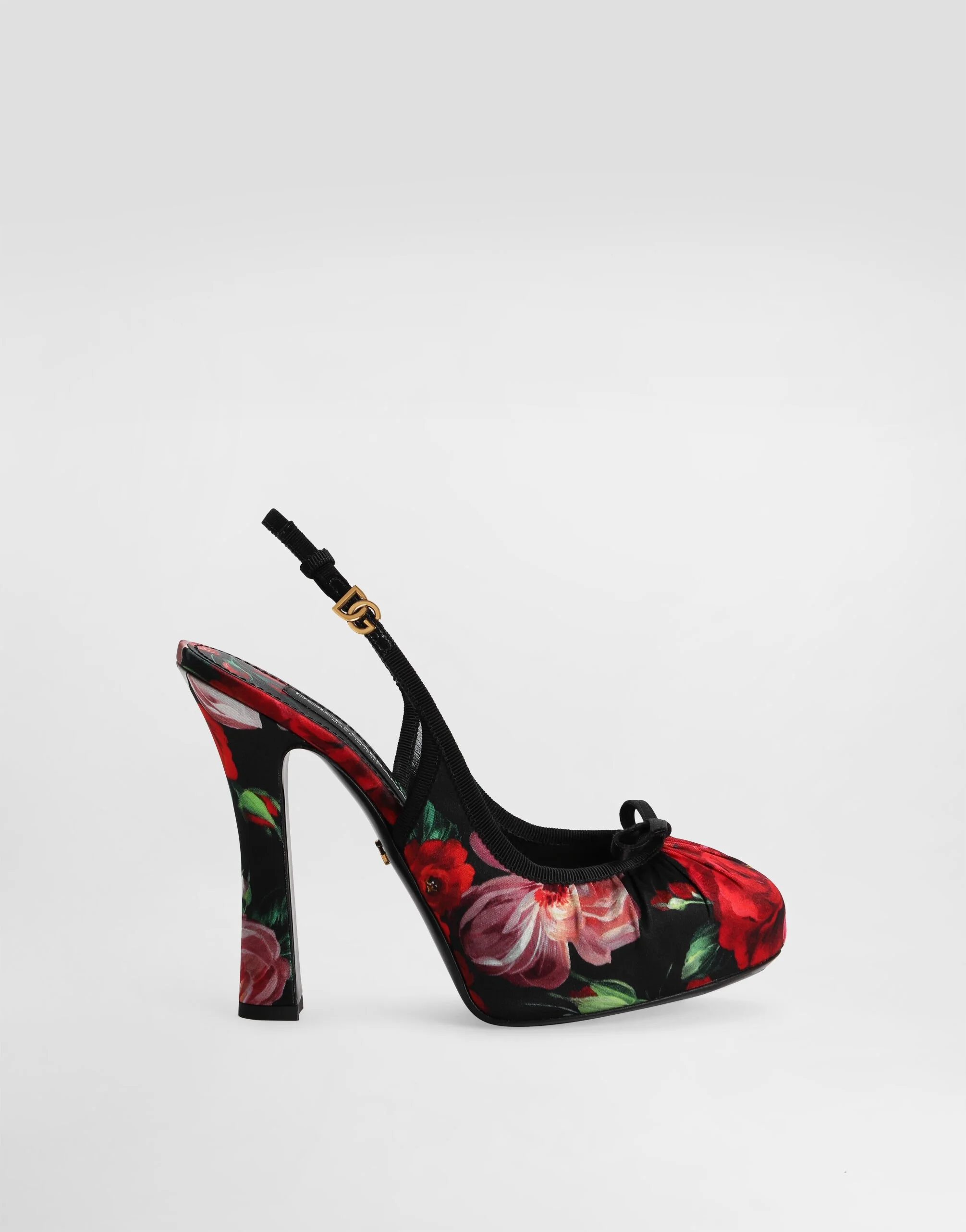 Beauty, sensuality and allure have inspired the Sfilata collection. These new Vally slingbacks come in printed hand-gathered satin with gros-grain piping and bow applique on the upper. Satin platform slingbacks with antique rose print and bow detail: • Multi-colored • 105-mm platform • Adjustable gros-grain strap with DG logo • Printed kidskin insole with branded label • Branded leather sole • Item comes with a branded dust bag • Made in Italy “The difference in the print placement that you may find on this product is a feature of Dolce&Gabbana’s “Handmade” pieces. A detail that makes every garment or accessory unique and exclusive.” External composition: 47% Cotton 53% Viscose Internal composition: 75% Goatskin 24% Viscose 1% Spandex