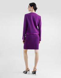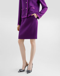 The Everyday Women's Collection reimagines contemporary daily wear with Dolce&Gabbana's signature style codes. Iconic fabrics mix with standout details like embroidered flowers, crystals, and jewel buttons, infusing elegance into every look. Gray animal print accented with green and purple, hyper-geometric jewelry, voluminous shapes and transparencies add unique touches. Men's tweed is reinvented with graphic twists, creating distinctive pieces that reflect refined sensuality. Double wool crepe midi pencil skirt with duchesse waistband: • Purple • High-waisted • Silk satin lining • Rear zipper and hook-and-bar fastening • The piece measures 55 cm from the waist down on a size IT 40 • The model is 175 cm tall and wears a size IT 40 • Made in Italy External composition: 90% Wool 08% Silk 02% Polyester Internal composition: 100% Silk
