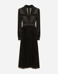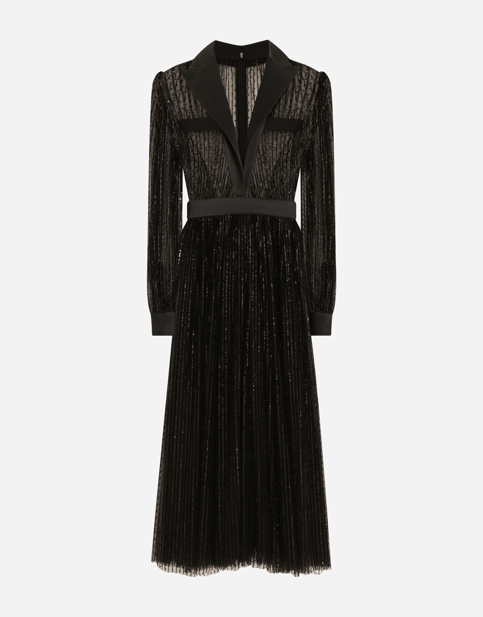 Menswear and womenswear mix and mingle, influencing one another and creating tailoring that embraces endless nuances, from the boldest to the most sophisticated, to define the rules of eternally classy femininity. A monochrome retelling in Nero Sicilia black, embellished by golden touches and rhinestones, adorning clean lines and incorporating stylish fabrics such as velvet, chiffon, lace, organza, and unique mesh details, the expression of authentic beauty for dresses, shirts and accessories. Calf-length tulle tuxedo shirt dress with sequin embellishment: • Black • Satin peak lapels • Long sleeves with satin cuffs • Removable stretch silk crepe de chine underskirt • Rear zipper and hook-and-bar fastening • The piece measures 90 cm from the waist down on a size IT 40 • The model is 175 cm tall and wears a size IT 40 • Made in Italy External composition: 80% Polyamide 18% Silk 02% Polyester Internal composition: 91% Silk 9% Spandex
