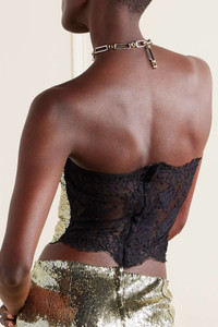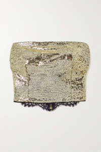 EDITORS'NOTES Dolce&Gabbana reinvents its signature bustier top with this version from its latest capsule, inspired by Hollywood's Golden Age. It's made from tulle covered with glittering sequins and black scalloped lace. Wear yours to glamorous events with the matching skirt and barely-there heels. SIZE & FIT - Fits large to size, take one size smaller than normal - Designed for a close fit - Cropped length - Lightweight, heavily embellished, slightly stretchy fabric - Model is 177cm/ 5'10", normally wears an IT 40 and is wearing an IT 38 DETAILS & CARE - Black lace, gold sequined tulle - Concealed hook and zip fastening at back - 50% polyamide, 37% cotton, 13% polyester - Dry clean Large to size. See Size & Fit notes.