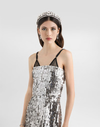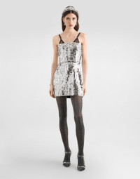 Elegance, tailored lines and sparkling details define the Dolce&Gabbana Holiday collection. Sixties inspirations blend with a contemporary aesthetic. For him, structured jackets and cuts that enhance the silhouette for her, silver brocade and crystals illuminate festive looks. Each piece stands out for its fine materials, attention to detail and distinctive style. This sequined dress is the perfect choice for elegant evenings and special occasions. The strapless design and short skirt give it a glamorous and sophisticated look, ideal for those who want to shine in style. Sequin dress: • Silver • Strapless bodice cut at the waist • Boned tulle inner bodice • Back zip closure • Lined skirt with trimmed hem • Length from the waist is 40 cm on size 40 IT • Made in Italy External composition: 100% Polyester Internal composition: 92% Silk, 8% Elastane