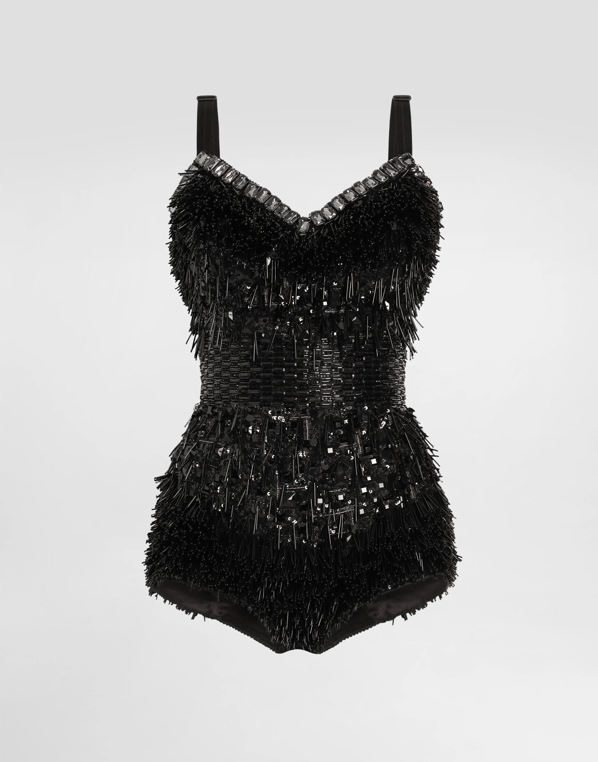 The Spring/Summer 2025 Women’s Collection is celebrating Italian beauty through bold and charismatic femininity. The 50s-inspired lingerie is the star, intermingling with fitted dresses, corsets and oversize trench coats. The iconic jackets have been updated with cropped cuts and modern inserts, while the floral prints add a romantic edge. The eveningwear shines with light fabrics and crystals, accompanied by look-defining accessories, from iconic bags to the cross earrings. Sequined and micro-beaded bodysuit: • Black • Sweetheart neckline • Sleeveless with stretch straps • Silk and cotton lining • Elasticated marquisette on the back • Zipper fastening at the back • The model is 175 cm tall and wears a size IT 40 • Made in Italy External composition: 70% Polyester 25% Polyamide 5% Spandex Internal composition: 65% Silk 30% Cotton 5% Spandex
