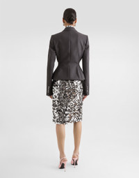 The Everyday Women's Collection reimagines contemporary daily wear with Dolce&Gabbana's signature style codes. Iconic fabrics mix with standout details like embroidered flowers, crystals, and jewel buttons, infusing elegance into every look. Gray animal print accented with green and purple, hyper-geometric jewelry, voluminous shapes and transparencies add unique touches. Men's tweed is reinvented with graphic twists, creating distinctive pieces that reflect refined sensuality. Sequined midi skirt: • Silver • High-waisted • Stretch silk satin lining • Rear zipper and hook-and-bar fastening • The piece measures 60 cm from the waist down on a size IT 40 • The model is 175 cm tall and wears a size IT 40 • Made in Italy External composition: 95% Polyester 05% Spandex Internal composition: 92% Silk 8% Spandex