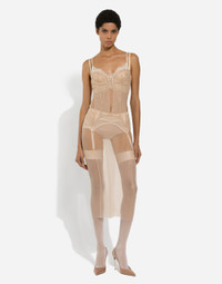 In the “WOMAN SS 24” Collection, the imagery of old Sicily interacts with the masculine, with sensual shapes, lace, nude tones and delicate overlays, to create pieces that move amid clean silhouettes, the elegance of the 1960s, the contrasts of black and white and luxurious textures. The designers are reworking their signature style and their iconic Sicilia black color to convey an aware, seductive and confident Sicilian WOMAN who is imbued with sensuality. Stretch tulle calf-length dress with corset details: • Pink • Sweetheart neckline • Corset details • Underwired cups • Stretch silk crepe de chine slip • Rear zipper and hook-and-eye fastening • The piece measures 90 cm from the waist down on a size IT 40 • The model is 175 cm tall and wears a size IT 40 • Made in Italy External composition: 74% Polyamide 16% Spandex 10% Silk Internal composition: 91% Silk 09% Spandex