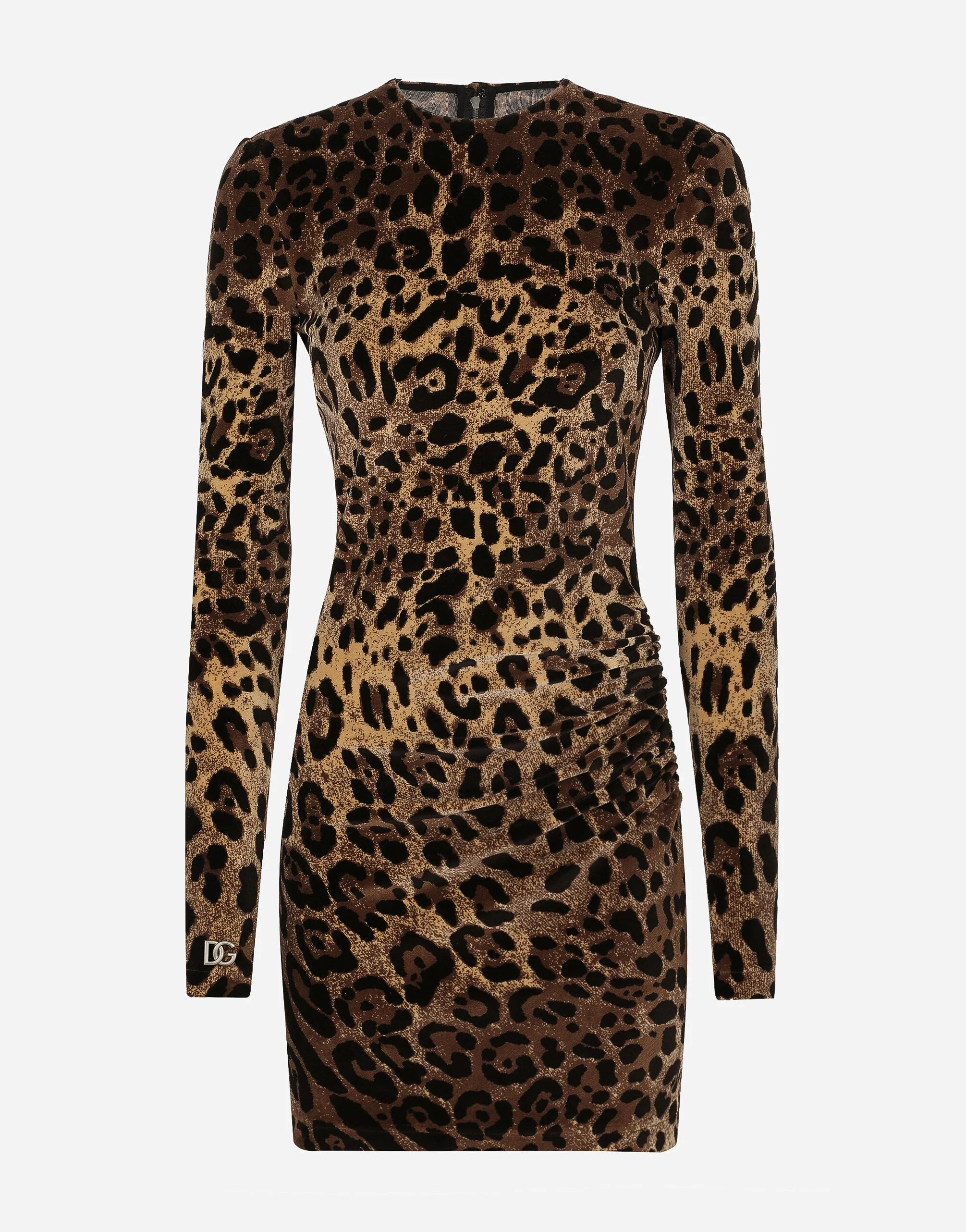 Short cotton chenille dress with jacquard leopard design: • Animal print • Round neck • Long sleeves • Unlined • Rear zipper and hook-and-eye fastening • The piece measures 45 cm from the waist down on a size IT 40 • The model is 175 cm tall and wears a size IT 40 • Made in Italy Care And Details External composition: 85% Cotton 15% Polyamide