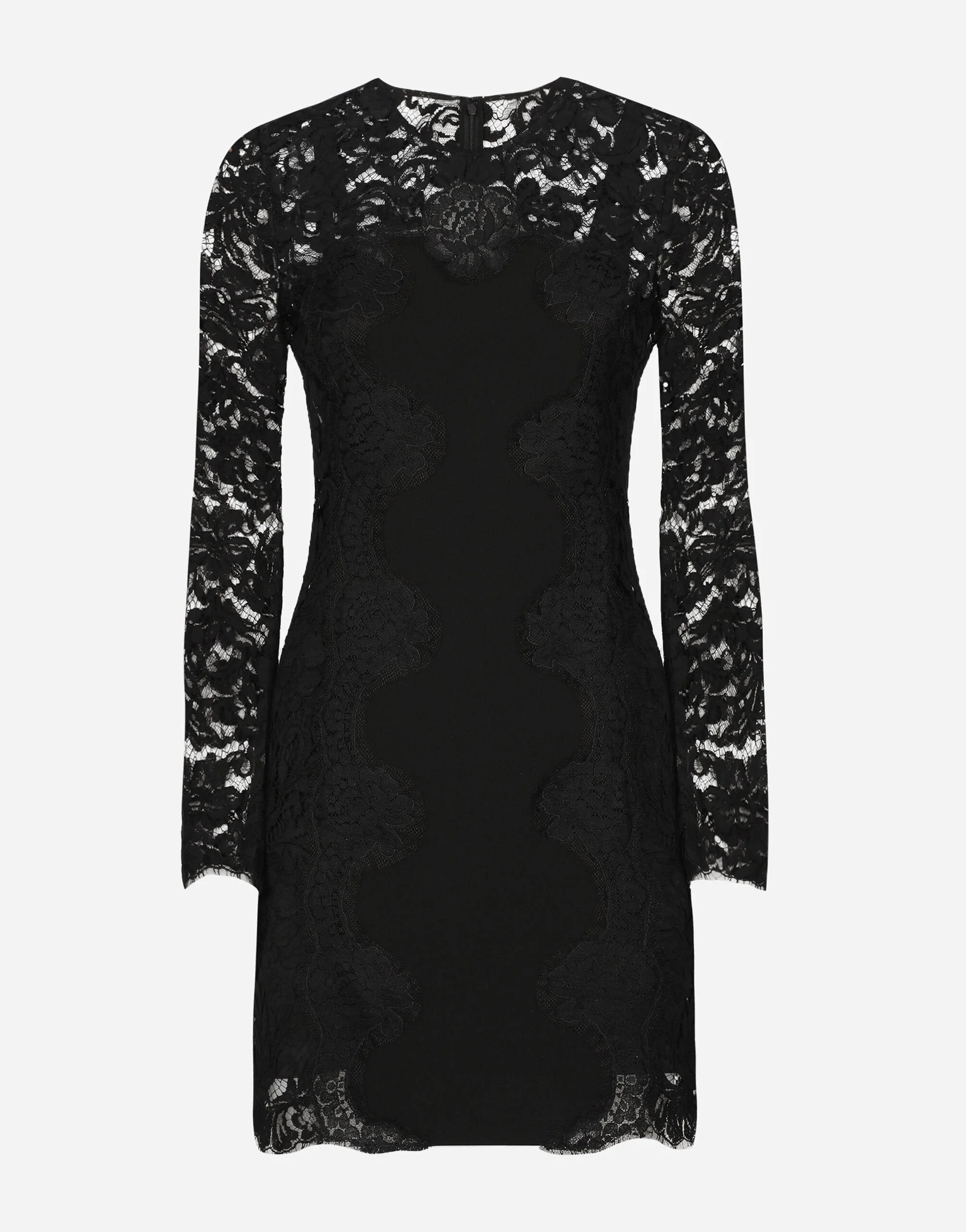 In the Black Sicily Collection, black, the absolute protagonist, becomes sensual black, sheer black, Dolce&Gabbana black. The key concept is “Black on Black”. Playing around with proportions, volumes, layered fabrics and sheer details, this style becomes absolute, bold and sexy. Unique and unmistakable, it is conveyed through the contrasts between glossy and matte fabrics, lines, volumes and special details, thereby expressing a woman’s various personalities and the true identity of Dolce&Gabbana. Short cordonetto lace dress with a stretch jersey insert: • Black • Round neck • Long sleeves • Form fitting • Stretch silk crepe de chine slip dress • Invisible zipper and hook-and-eye fastening on the back • The piece measures 85 cm from the center back on a size IT 40 • The model is 175 cm tall and wears a size IT 40 • Made in Italy External composition: 48% Cotton 27% Viscose 23% Polyamide 2% Spandex Internal composition: 91% Silk 9% Spandex