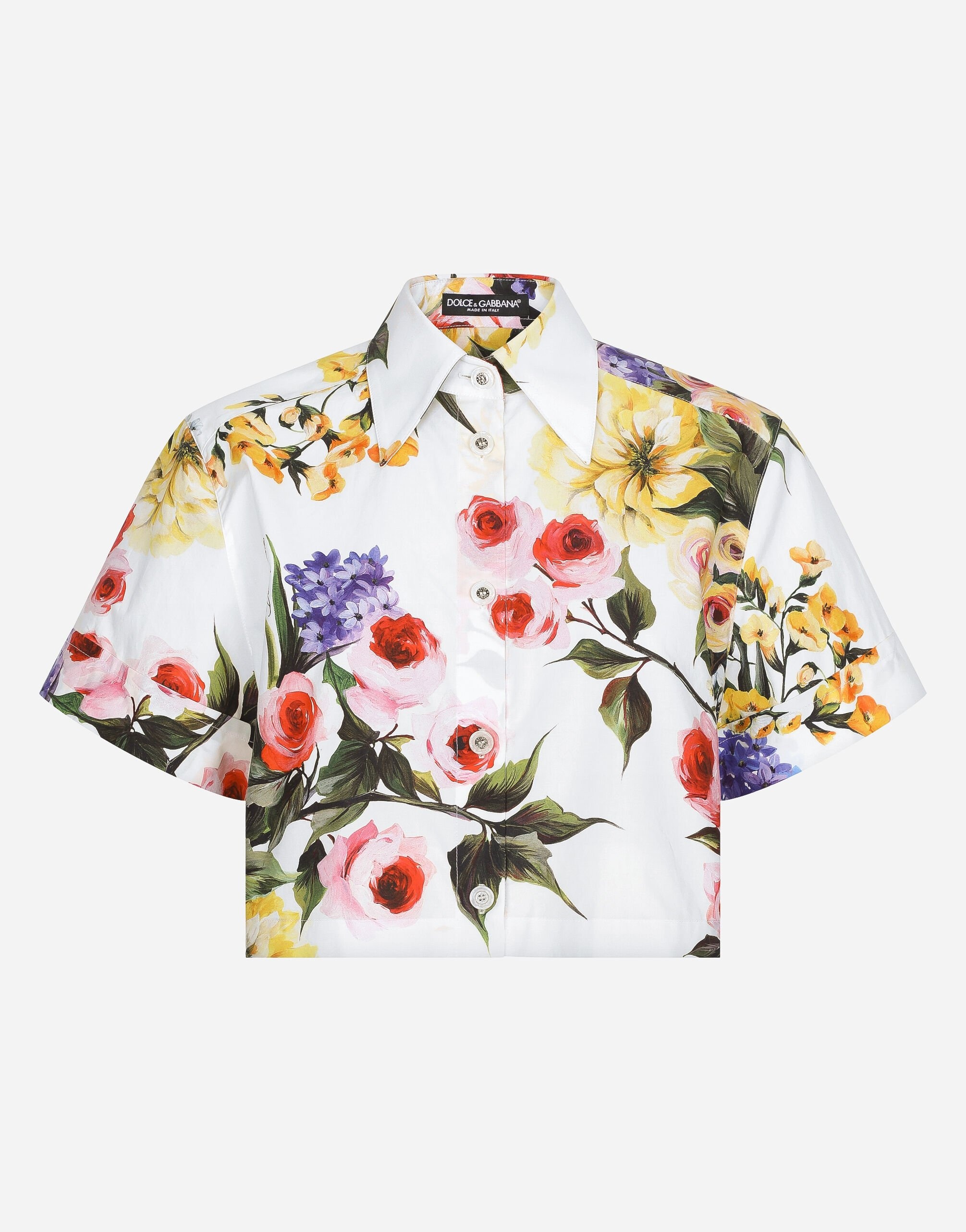 The spirit of the 1960s is taking over the new Flower Power collection. The focus is a head-to-toe floral look built around pairing and layering rose, anemone and floral bouquet maxi-prints. A cosmopolite poised between playful and sexy, this woman interprets the austerity and elegance of the 1960s, harking back to boldly opulent imagery that here at Dolce&Gabbana is condensed and reinterpreted through silhouettes, ample proportions and airy shapes, bringing femininity and sensuality to the forefront. Short cotton poplin shirt with garden print: • Multi-colored • Shirt collar • Short sleeves • Cropped fit • Button fastenings with branded bottom edge • The piece measures 43 cm from the center back on a size IT 40 • The model is 175 cm tall and wears a size IT 40 • Made in Italy The difference in the print placement that you may find on this product is a feature of Dolce&Gabbana’s “Handmade” pieces. A detail that makes every garment or accessory unique and exclusive. External composition: 100% Cotton