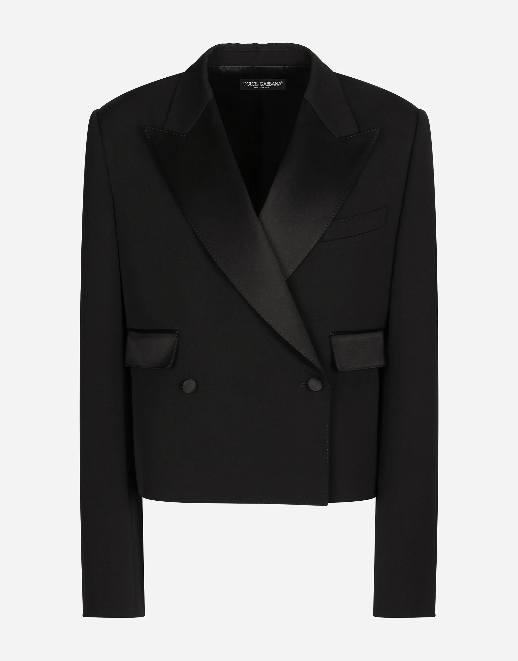 Menswear and womenswear mix and mingle, influencing one another and creating tailoring that embraces endless nuances, from the boldest to the most sophisticated, to define the rules of eternally classy femininity. A monochrome retelling in Nero Sicilia black, embellished by golden touches and rhinestones, adorning clean lines and incorporating stylish fabrics such as velvet, chiffon, lace, organza, and unique mesh details, the expression of authentic beauty for dresses, shirts and accessories. Short double-breasted wool gabardine tuxedo jacket: • Black • Satin peak lapels • Long sleeves • Regular fit • Silk satin lining • Satin-covered button fastenings • The piece measures 60 cm from the center back on a size IT 40 • The model is 175 cm tall and wears a size IT 40 • Made in Italy External composition: 81% Virgin Wool 15% Silk 04% Polyester Internal composition: 100% Silk