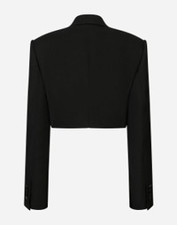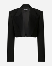 Short double wool tuxedo jacket: • Black • Duchesse peak lapels • Long sleeves • Faux flap pockets • Silk satin lining • Button fastenings • The piece measures 42 cm from the center back on a size IT 40 • The model is 175 cm tall and wears a size IT 40 • Made in Italy Care And Details External composition: 83% Virgin Wool 13% Silk 4% Polyester Internal composition: 100% Silk