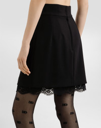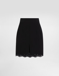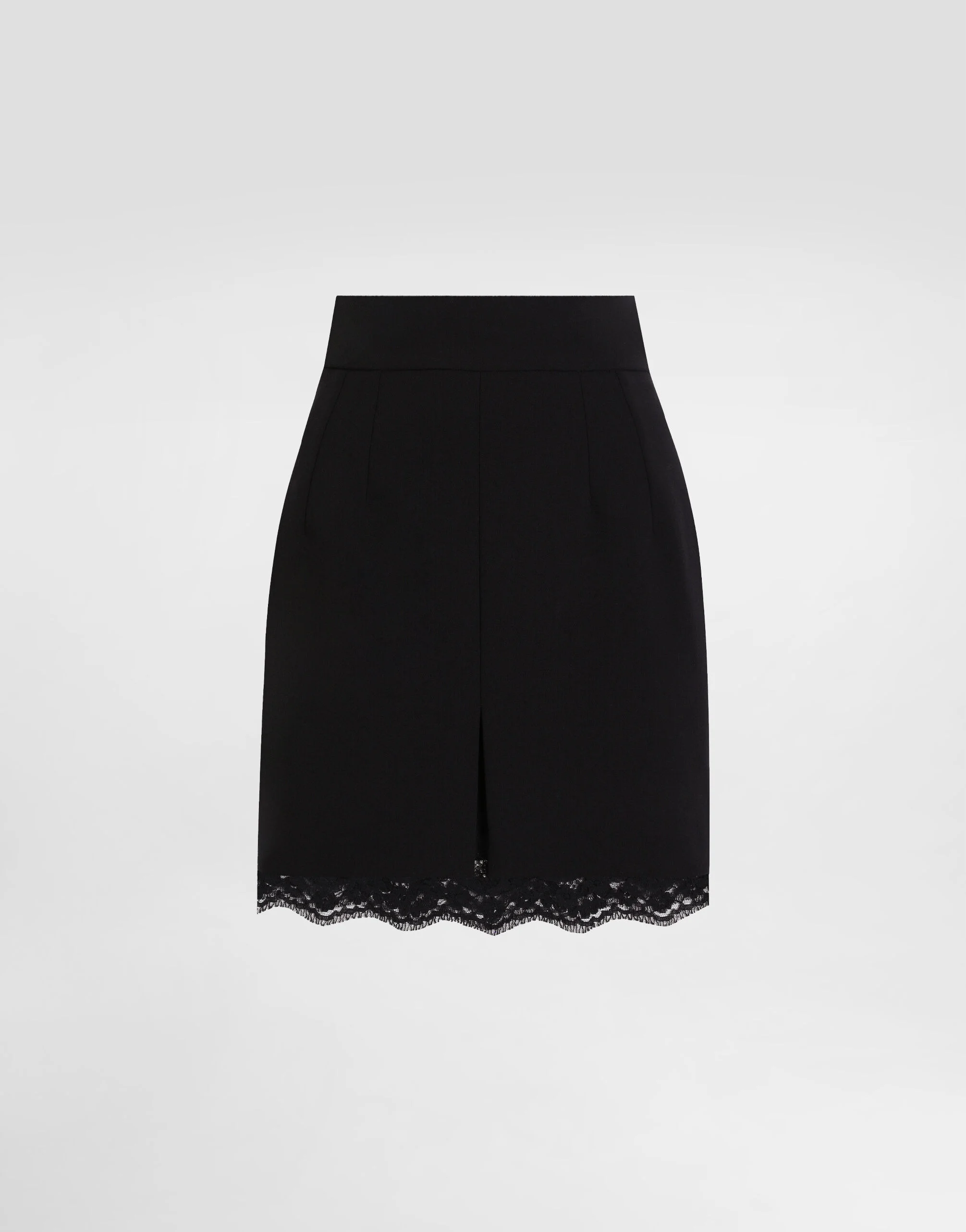 This skirt expresses a bold and sophisticated femininity thanks to its refined design and elegant details. Perfect for those who love a distinctive and refined style, it adapts to different occasions, from casual chic to formal, with a touch of glamour. Skirt in double wool crepe: • Black • Exposed lace from the bottom • Kissed slit at the center front • Covered zip at the center back • Lined • The model is 175 cm tall and wears size 40 IT • Made in Italy External Composition: 100% Virgin Wool Internal Composition: 83% Silk, 7% Cotton, 7% Elastane, 3% Polyamide