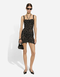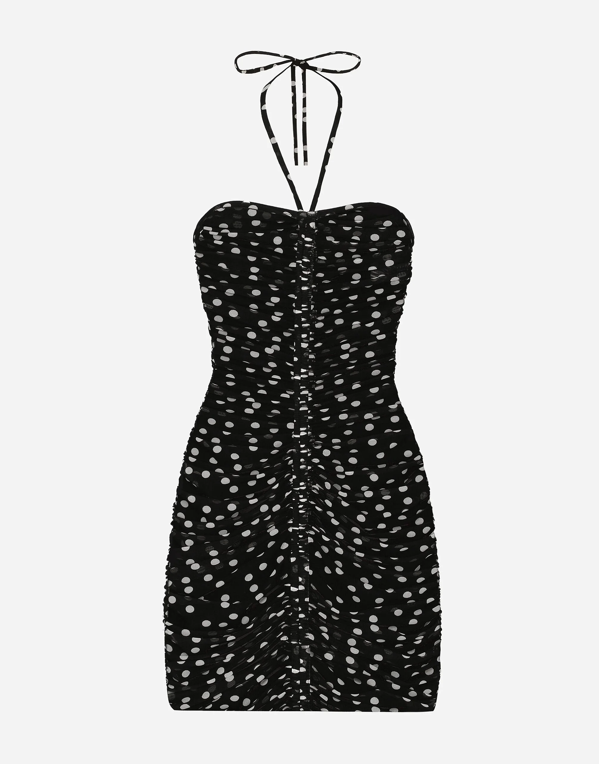 The FW24/25 Mambo Collection is rewriting the rules of Italian elegance, merging the sophisticated style of the 1940s and 1950s with the iconography of American pin-ups. The unmistakable polka-dot motif takes center stage, coming in a variety of shapes and sizes and adorning tulle, charmeuse, twill, silk and poplin, giving life to looks distinguished by black and white accessories and details. An homage to the beauty of Italy and its traditions, the distinctive details of Dolce&Gabbana’s creations. Short draped tulle dress with polka-dot print: • Black • Sweetheart neckline with halterneck tie • Tulle lining • Rear zipper and hook-and-eye fastening • The piece measures 45 cm from the waist down on a size IT 40 • The model is 175 cm tall and wears a size IT 40 • Made in Italy The difference in the print placement that you may find on this product is a feature of Dolce&Gabbana’s “Handmade” pieces. A detail that makes every garment or accessory unique and exclusive. External composition: 92% Polyamide 08% Spandex Internal composition: 82% Polyamide 18% Spandex
