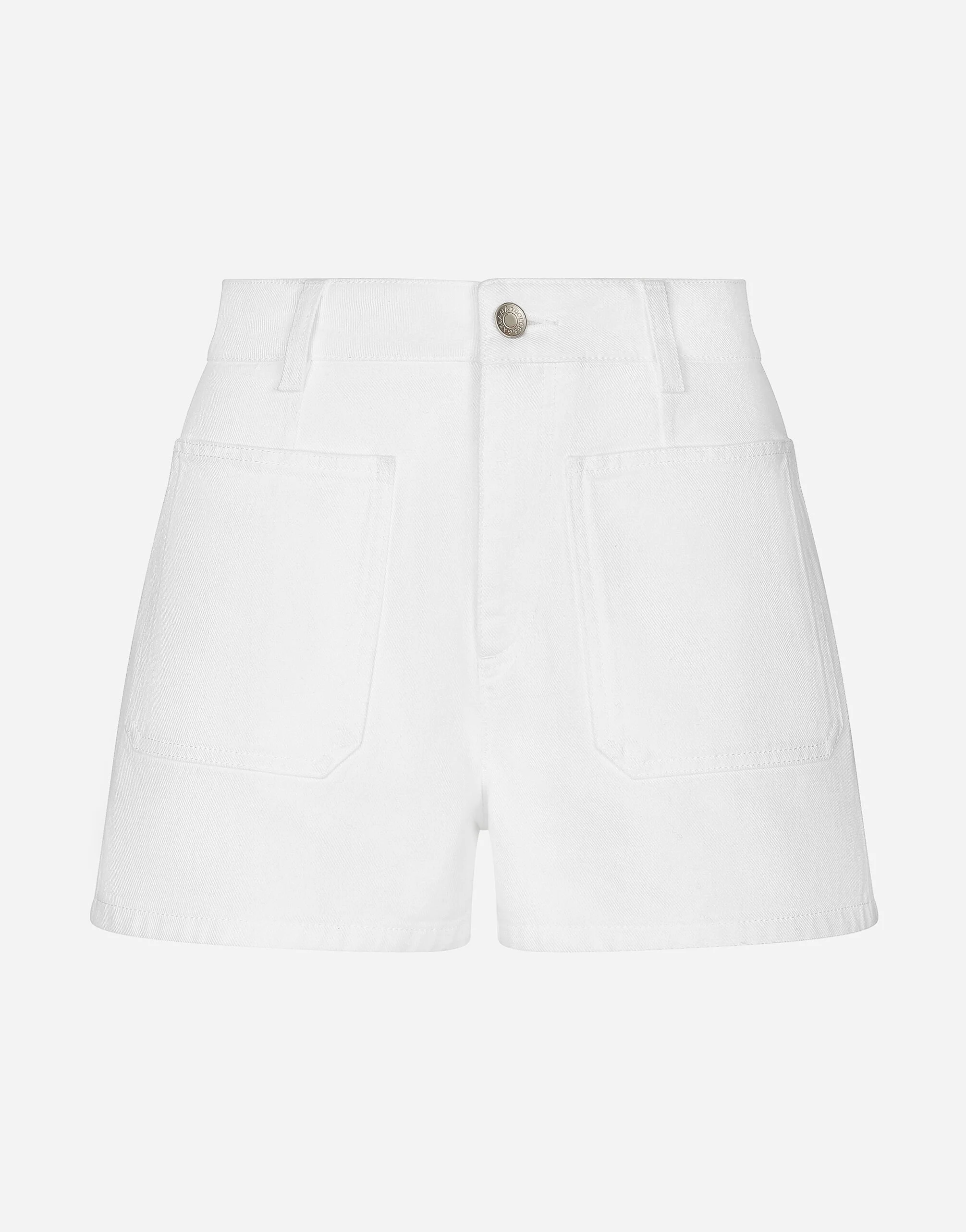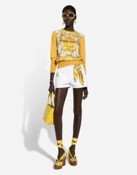 The Majolica, a symbol of Italian craftsmanship, comes in lemon yellow for the FW24/25 Collection. This vibrant hue, brightened up by pure white, evokes summer light dancing on the quintessential Sicilian homes that look out to the sea. Evocative color detailing gives the brand’s iconic pieces and accessories a bold edge, which is extraordinarily feminine and vibrant. A tribute to the majolica art that, once again, enhances Dolce&Gabbana’s signature aesthetic. Denim shorts: • White • Regular rise • Front pockets • Branded metal and leather tag • Branded label on the coin pocket • Zipper and branded metal button fastening • The model is 175 cm tall and wears a size IT 40 • Made in Italy External composition: 100% Cotton