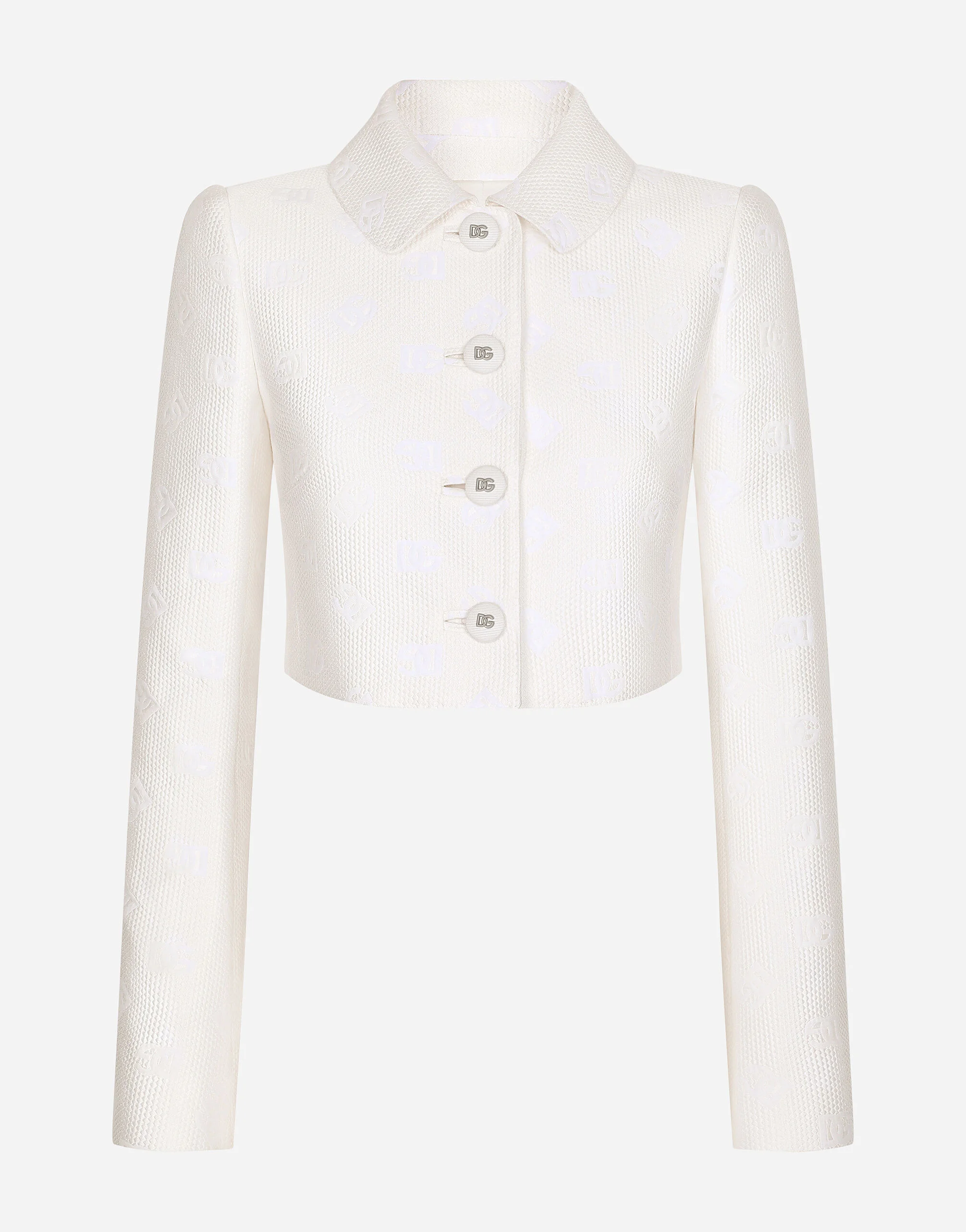 Short jacquard jacket with all-over DG logo: • Shirt collar • Long sleeves • Stretch silk crepe de chine lining • Canneté-covered button fastenings and DG logo • The piece measures 35 cm from the rear collar seam on a size IT 40 • The model is 175 cm tall and wears a size IT 40 • Made in Italy Care And Details External composition: 43% Cotton 34% Polyester 23% Silk Internal composition: 91% Silk 3% Spandex