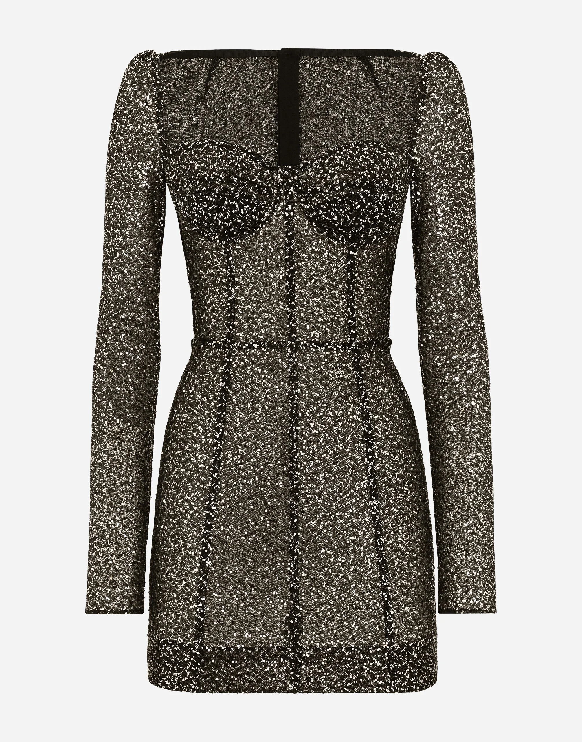 The Holiday collection is an extraordinary story that brings together two worlds: Dolce&Gabbana and the great stars from Hollywood’s Golden Age, who were recognized and admired for their wonderful dresses and extraordinarily glamorous looks. The designers are reinventing and making us dream in front of tailored pieces with breathtaking elegance and visual impact, a sparkling mood that will give everyone a modern, recognizable and unique allure on any occasion. Short long-sleeved sequined corset dress: • Silver • Sweetheart neckline • Lined underwired cups • Boned bodice • Long sleeves • Stretch silk satin underskirt • Rear zipper and hook-and-eye fastening • The piece measures 45 cm from the waist down on a size IT 40 • The model is 175 cm tall and wears a size IT 40 • Made in Italy External composition: 100% Polyester Internal composition: 64% Silk 30% Polyamide 6% Spandex