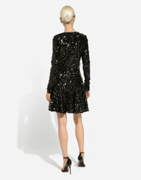 The Holiday collection is an extraordinary story that brings together two worlds: Dolce&Gabbana and the great stars from Hollywood’s Golden Age, who were recognized and admired for their wonderful dresses and extraordinarily glamorous looks. The designers are reinventing and making us dream in front of tailored pieces with breathtaking elegance and visual impact, a sparkling mood that will give everyone a modern, recognizable and unique allure on any occasion. Short long-sleeved sequined dress: • Black • Round neck • Long tulle-lined sleeves • Stretch silk satin lining • Rear zipper and hook-and-eye fastening • The piece measures 50 cm from the waist down on a size IT 40 • The model is 175 cm tall and wears a size IT 40 • Made in Italy External composition: 100% Polyamide Internal composition: 74% Silk 11% Cotton 10% Spandex 5% Polyamide