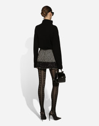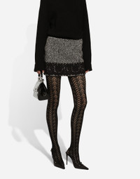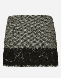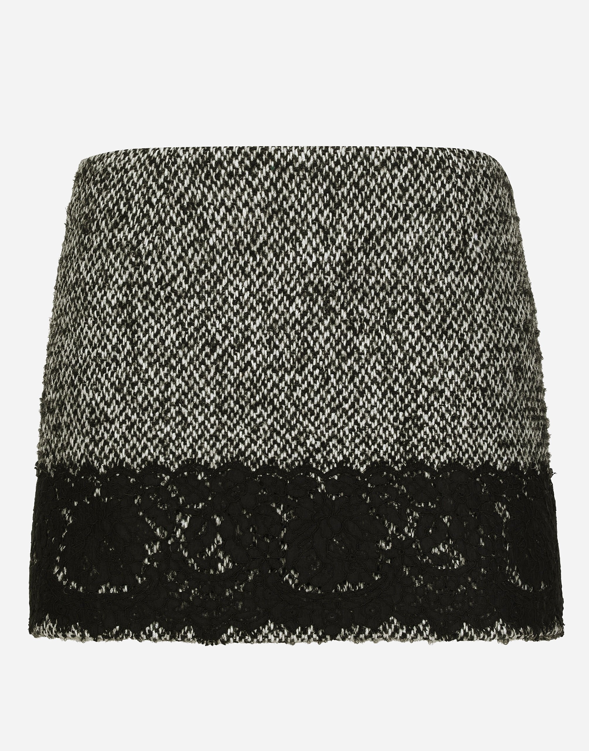 Inspired by 80s fashion photography, the Black Sicily collection masterfully blends masculine and feminine elements, pairing tailored cuts and corset details for the FW 24/25 season. A new vision of the iconic Nero Sicilia black is conveyed through contemporary and sensual looks: jackets and skirts in all-over glen plaid pair with openwork socks, while the 50s-inspired Mun shoes with Eva heel go with the houndstooth Sicily bag featuring crocodile-print leather inserts. Short wool micro-tweed skirt with lace insert: • Gray • Regular rise • Stretch silk satin lining • Rear zipper and hook-and-eye fastening • The piece measures 38 cm from the waist down on a size IT 40 • The model is 175 cm tall and wears a size IT 40 • Made in Italy External composition: 47% Wool 24% Cotton 14% Acrylic 6% Polyester 5% Polyamide 3% Alpaca 1% Viscose Internal composition: 92% Silk 8% Spandex