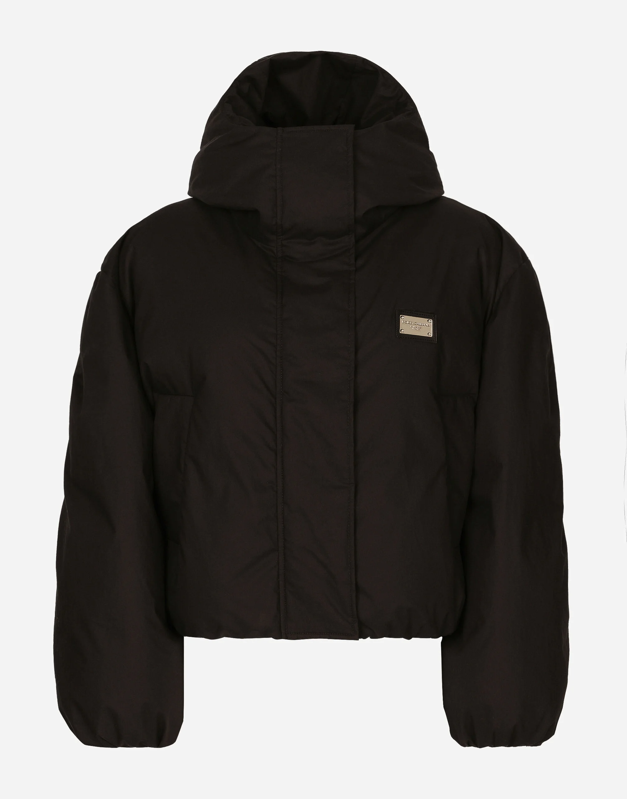 Padded short nylon jacket with hood: • Black • Long sleeves with elasticated cuffs • Regular fit • Stretch hem • Pockets with buttons • Eco-sustainable padding • Nylon lining • The piece measures 59 cm from the center back on a size IT 40 • The model is 175 cm tall and wears a size IT 40 • Made in Italy Care And Details External composition: 100% Cotton Internal composition: 70% Cotton 30% Polyester