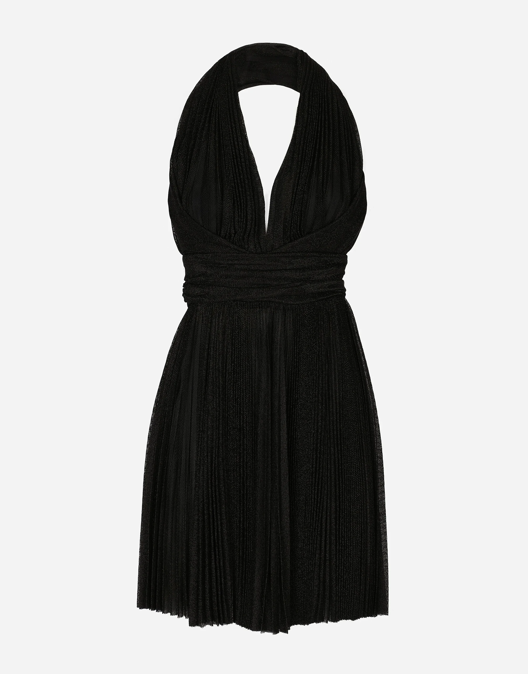 Short pleated lurex mesh dress: • Black • V-neck • Sleeveless • Unlined • Stretch silk crepe de chine high-waisted panties • Rear zipper and hook-and-eye fastening • The piece measures 45 cm from the waist down on a size IT 40 • The model is 175 cm tall and wears a size IT 40 • Made in Italy Care And Details External composition: 78% Acetate 22% Polyester Internal composition: 64% Silk 30% Polyamide 6% Spandex