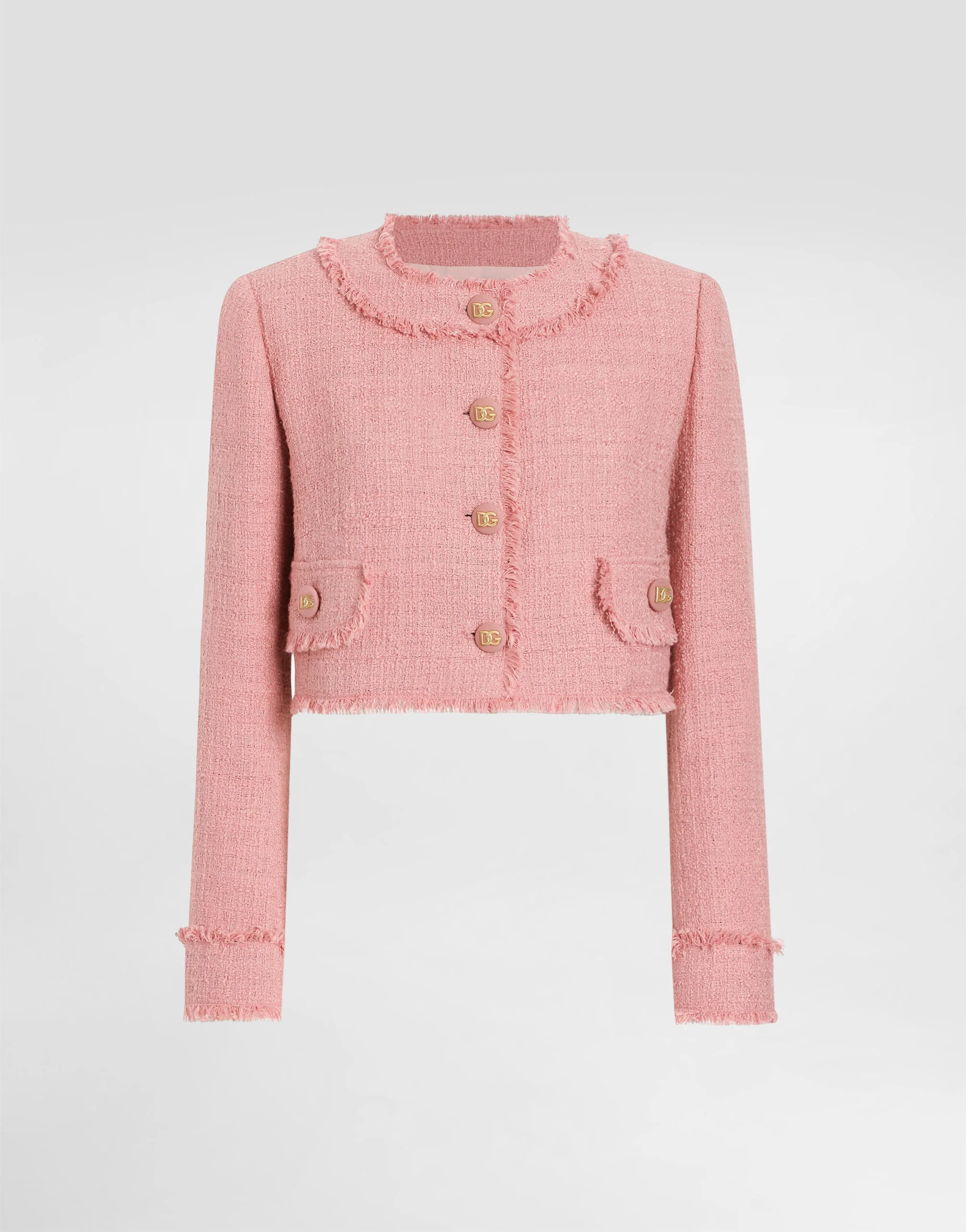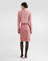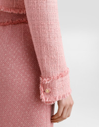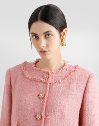 The Women’s DNA Collection is introducing a new side to femininity, which comes in shades of rose quartz, poised between sheerness and opacity, lightness and structure, formality and sensuality. Geometric Dolce Jackets, jacquard pajamas and floral brocade dresses intertwine with ultra-romantic designs. The DG print becomes an iconic statement, while Cordonetto lace and hints of Sicily Black embody the essence of a determined yet romantic femininity. Short cotton raschel tweed jacket: • Pink • Round neck • Long sleeves • Stretch silk crepe de chine lining • Cannete-covered button fastenings and DG logo • The piece measures 40 cm from the rear collar seam on a size IT 40 • The model is 175 cm tall and wears a size IT 40 • Made in Italy External composition: 90% Cotton 10% Viscose Internal composition: 91% Silk 09% Spandex